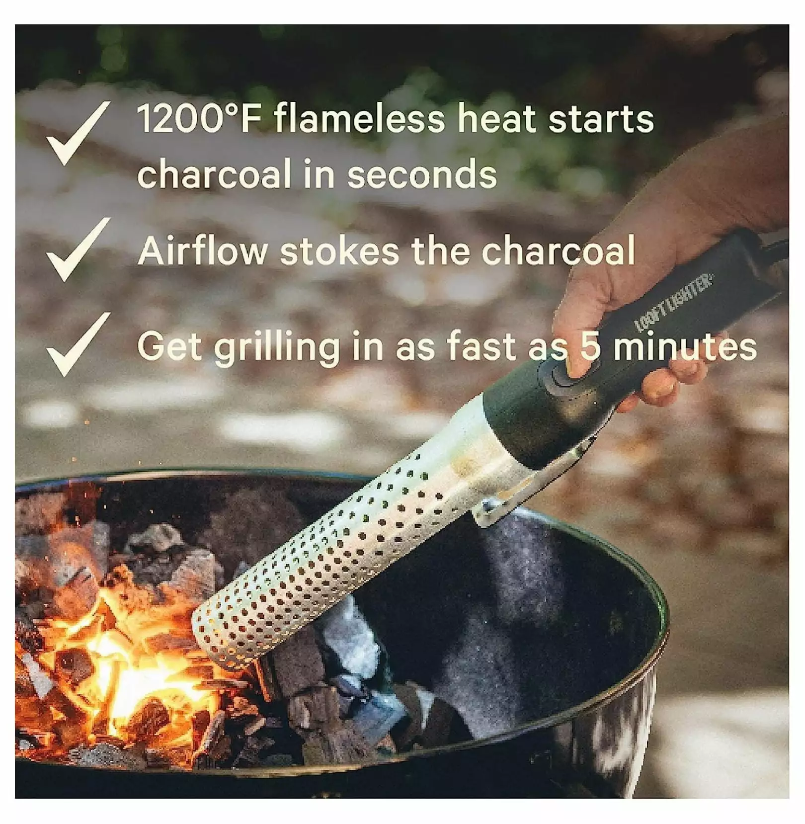 - QUICK – 1200 F flameless heat starts your charcoal in seconds so you can get grilling in as fast as 5 min. The superheated airflow in the Looft Air Lighter speeds up the process and turn the charcoal grey and grill ready in no time.