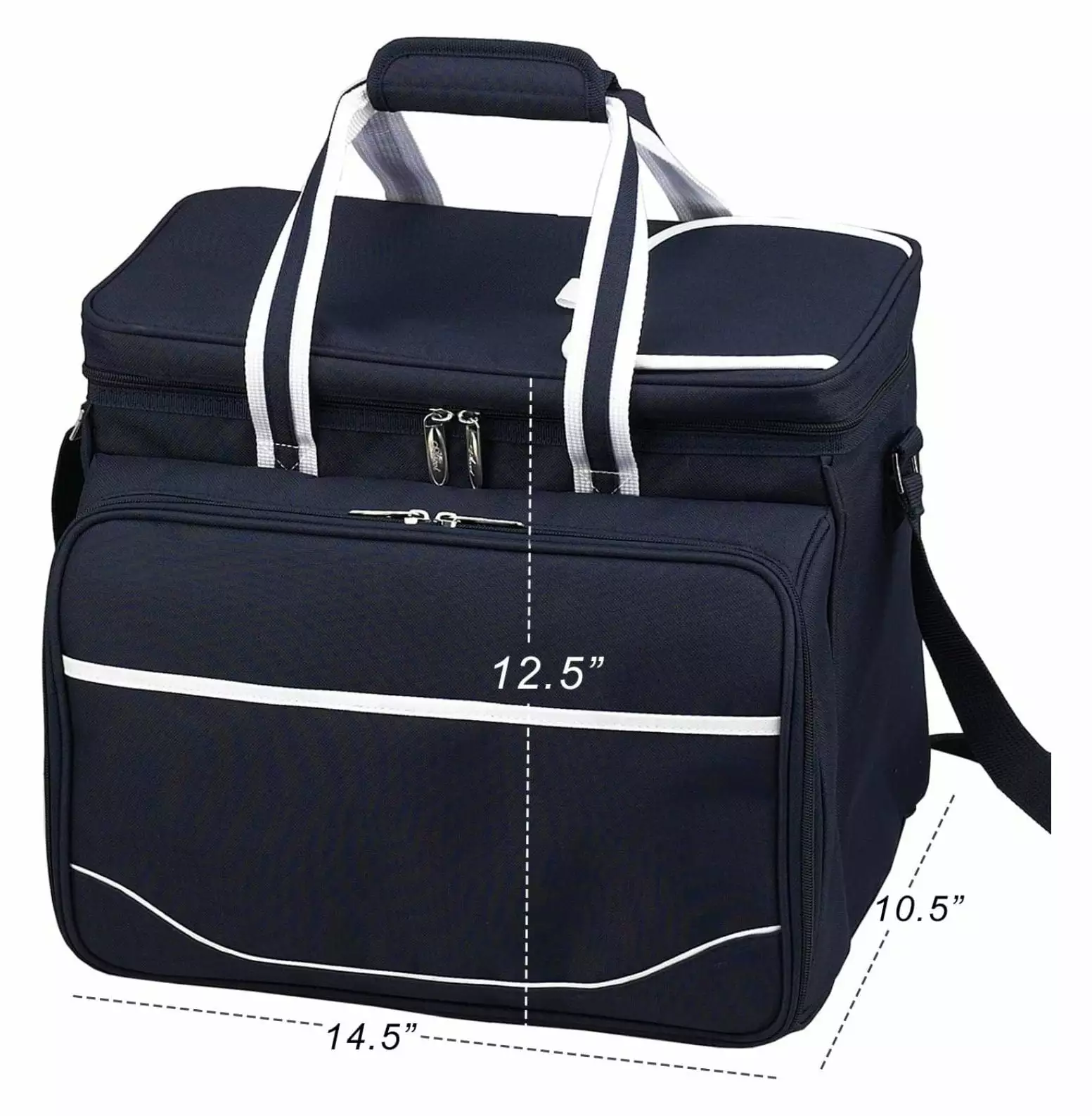 Fully equipped picnic cooler for four from our Bold Collection. Unique. divided Thermal Shield insulated cooler with separate sections for wine and food. Divider can be detached and folded to the back when a larger cooler space is needed. Easy drinks access panel in lid. The cooler is leak proof so may used with ice to extend cooling. Includes combination corkscrew. cheese knife. acrylic wine glasses. coordinating melamine plates and napkins. stainless steel flatware. Includes hand grip & adjustable shoulder strap. extra front pocket. 600D polycanvas. Designed and Assembled in the USA. Warranty.