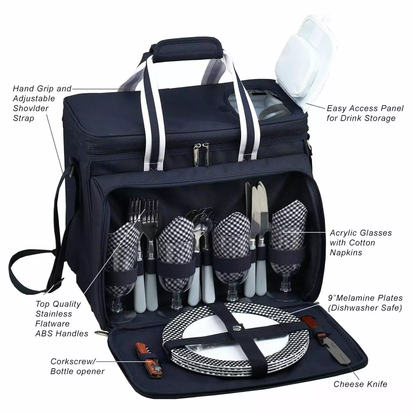 - ASSEMBLED IN THE USA – Deluxe Fully Equipped Insulated picnic cooler for 4 – great for trips to the park – outdoor concerts – sporting events – beach – camping and boating