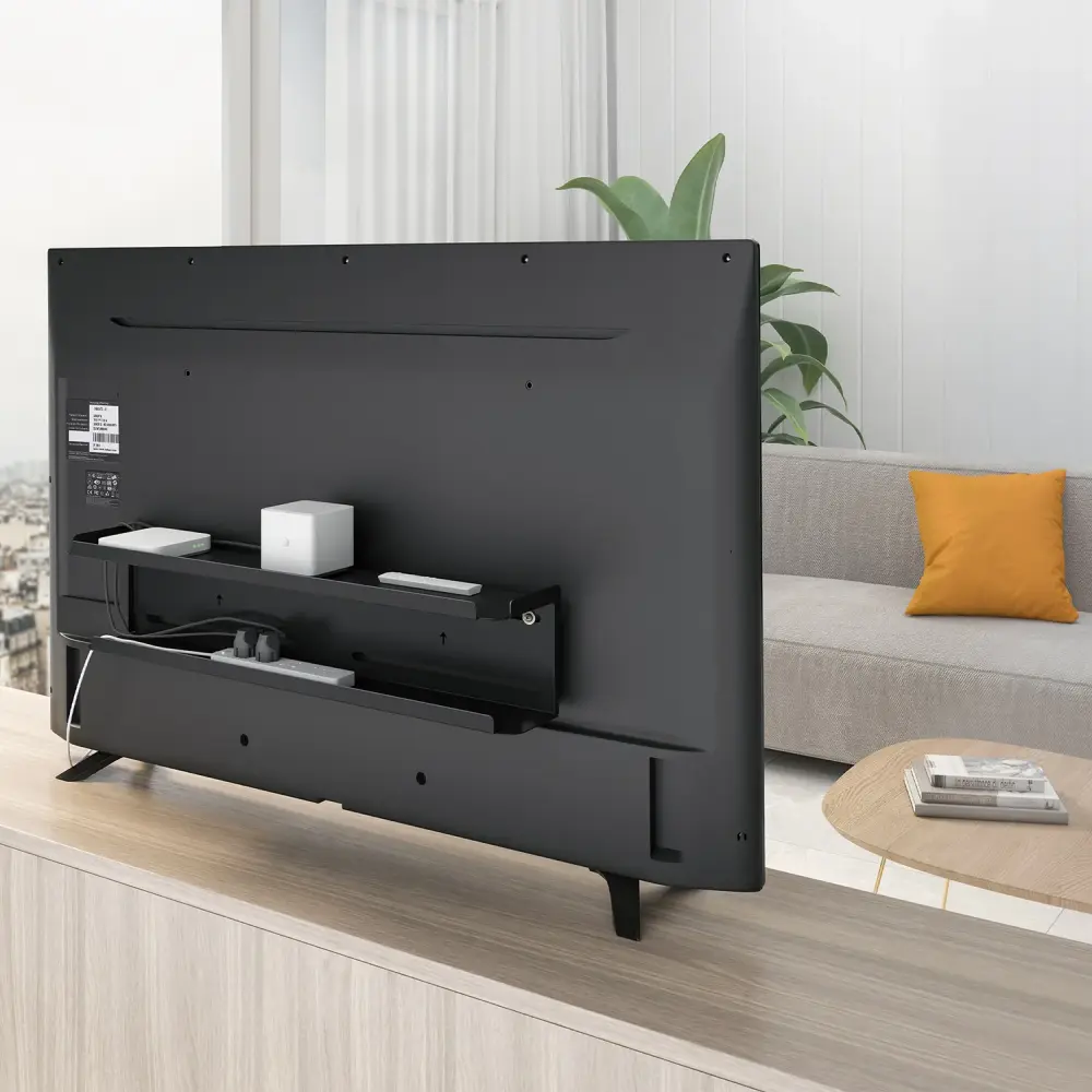 – Practical 2 in 1 storage shelf for TV accessories: mounting on a wall or on the back