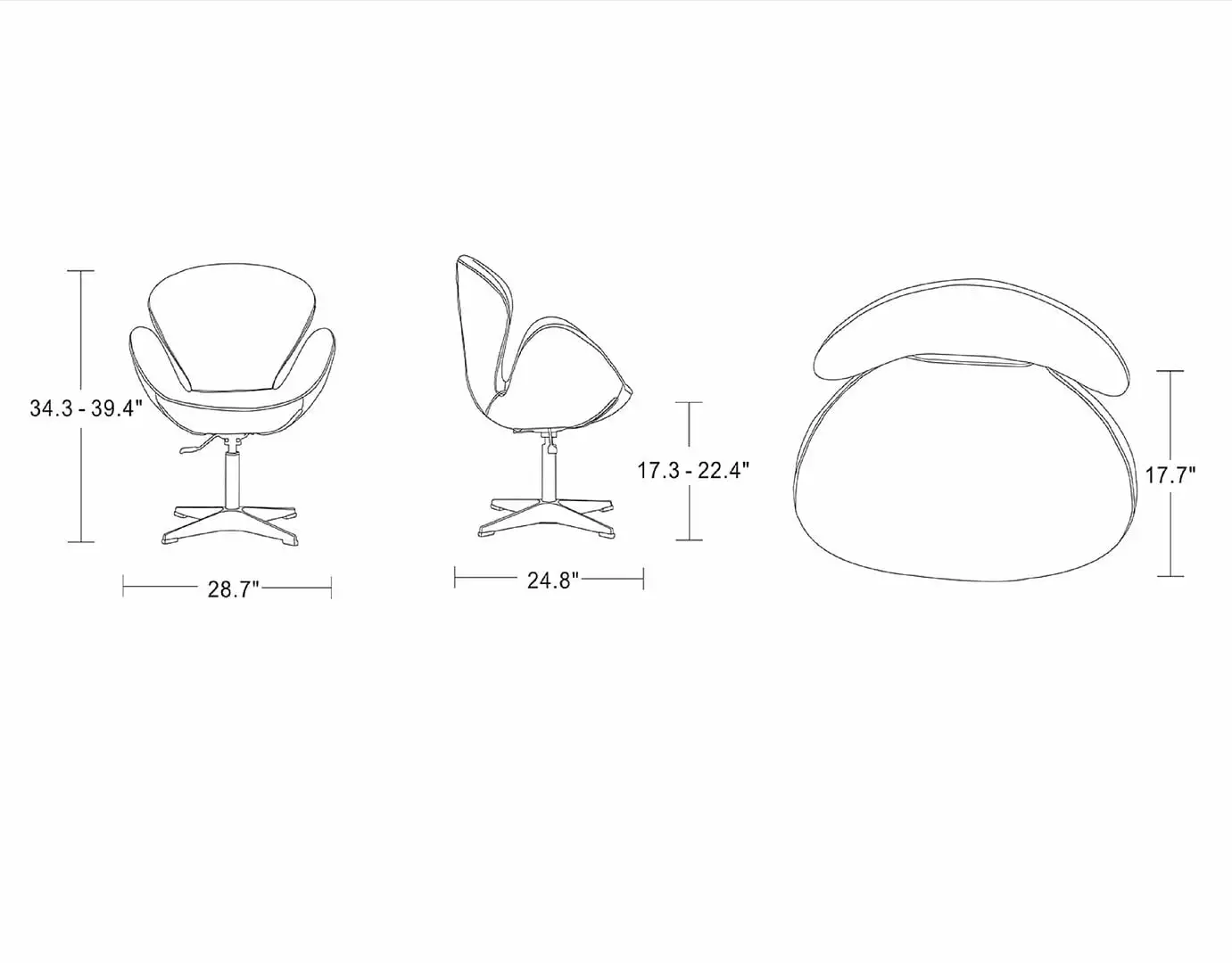 Modern Swivel Accent Chair for Living Room and Home Office Use. * Measures: 28.7 in. Length. 34.3-39.4 in. Height. 24.8 in. Depth. * Polished Chrome Metal Based with 4 Spider Legs. * Upholstered in Soft Wool Blend Fabric or Smooth Faux Leather with High Density Foam Filled Padding. * Features Height Adjustability with Full Swivel. * Unique Modern Dip Shaped Seat Design with Vertical Arm Openings. * Weight Capacity: 300 Lbs. Seat Adjustable Height: 17.3" – 22.4" * Minimal Assembly Required. All Hardware Included.