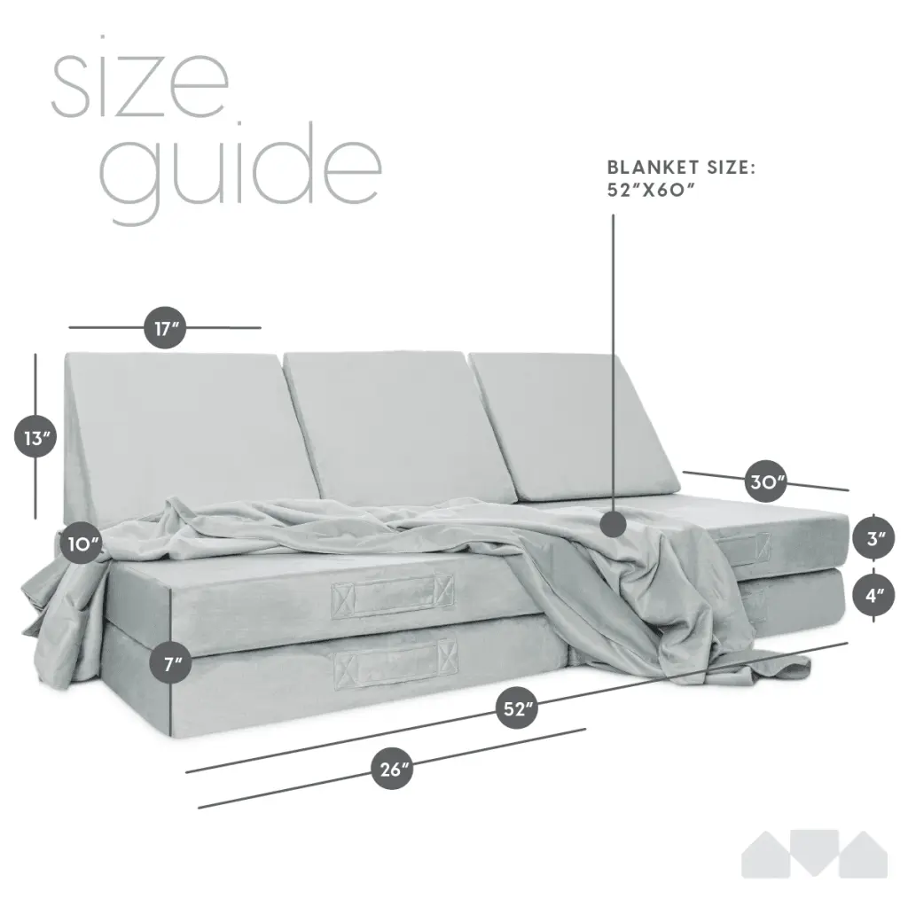 Interactive Play Haven: Tailored for toddlers and children. this play couch in soft grey velour fabric includes three flat-back triangle pillows that easily prop against a wall. two large rectangular cushions. and a bonus blanket. inspiring hours of creative play in an interactive haven.