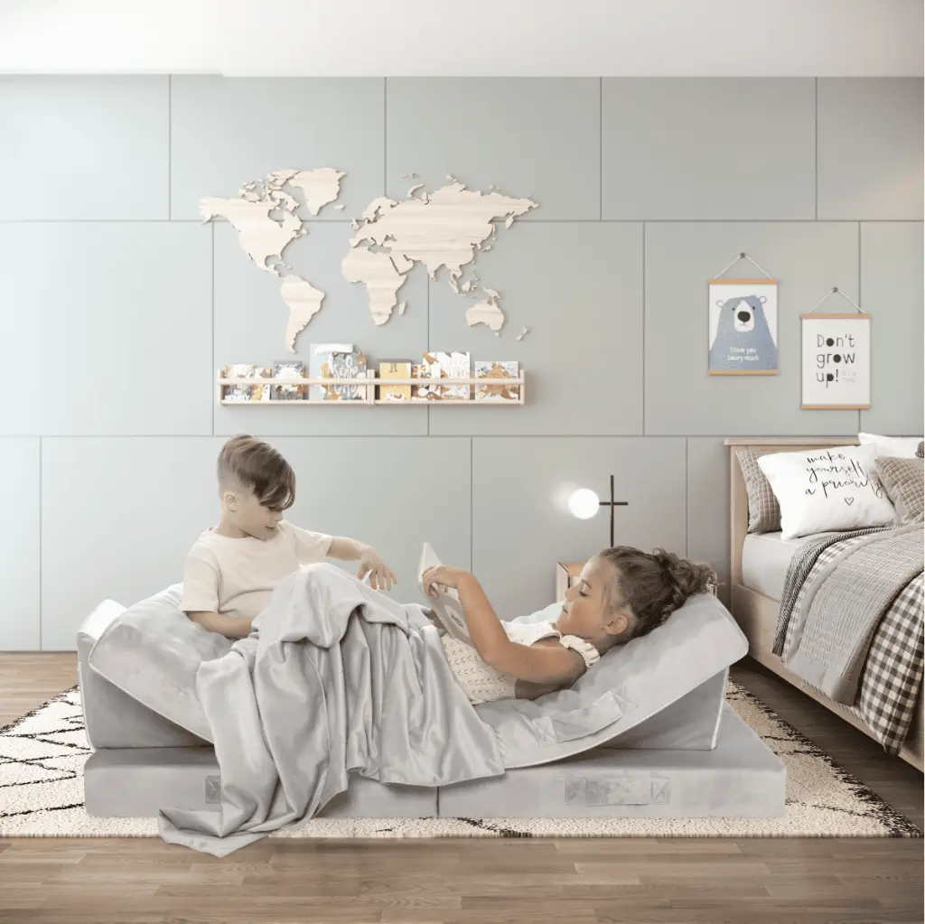 - Interactive Play Haven: Tailored for toddlers and children. this play couch in soft grey velour fabric includes three flat-back triangle pillows that easily prop against a wall. two large rectangular cushions. and a bonus blanket. inspiring hours of creative play in an interactive haven.