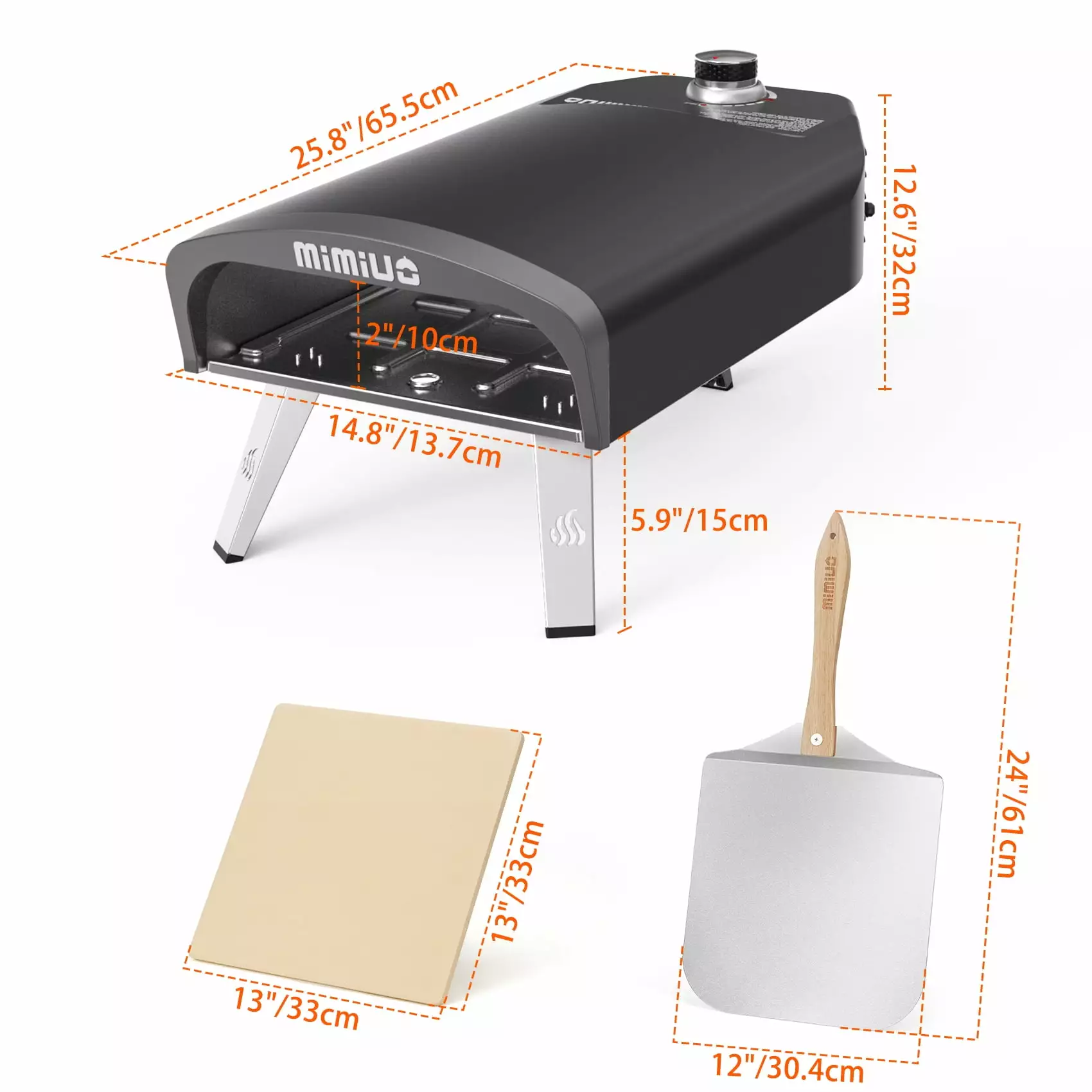 - [Perfect Size]Mimiuo Pizza Grilling Kit comes with the pizza oven. a 13 square pizza stone and a 12 * 14 pizza peel. The cordierite pizza stone has super high temperature resistance (up to 2200 H) and robust stability. tolerates an implausible amount of heat.