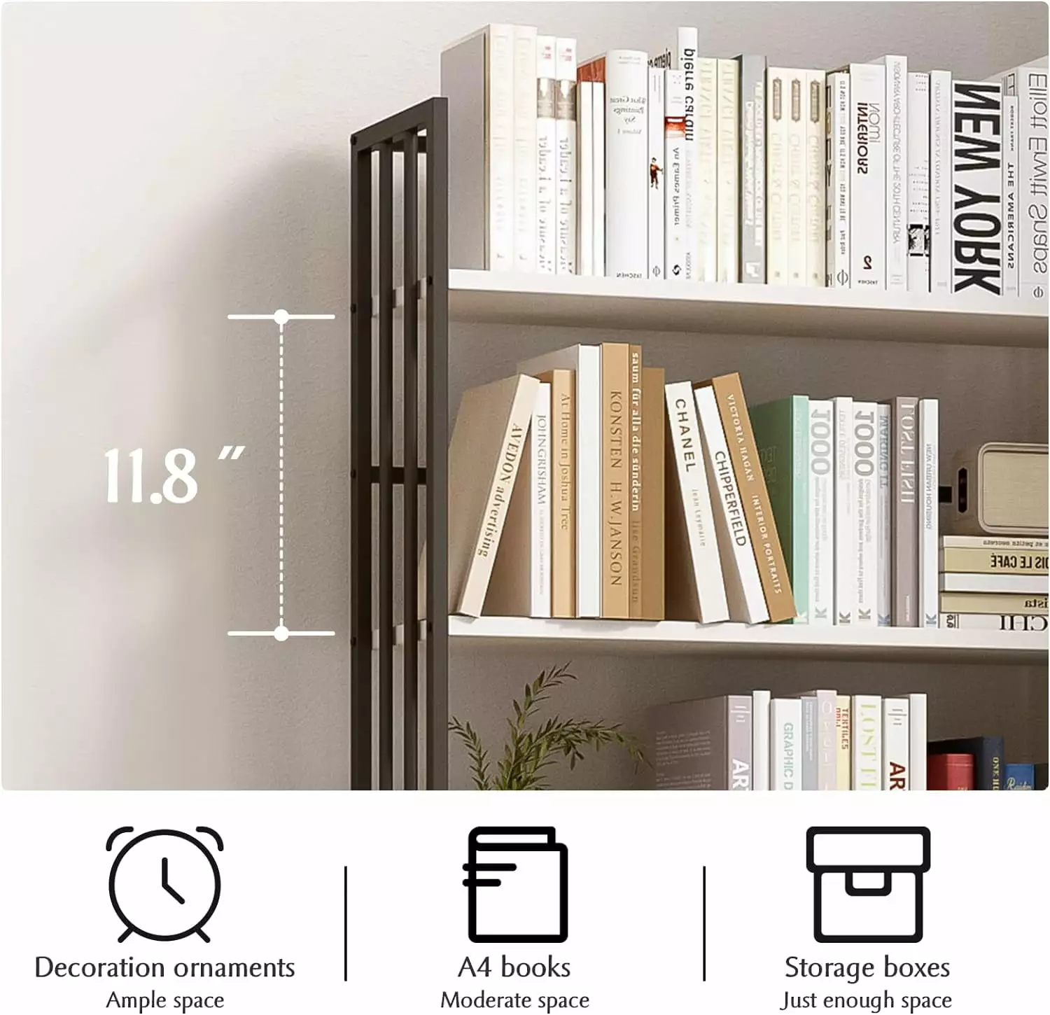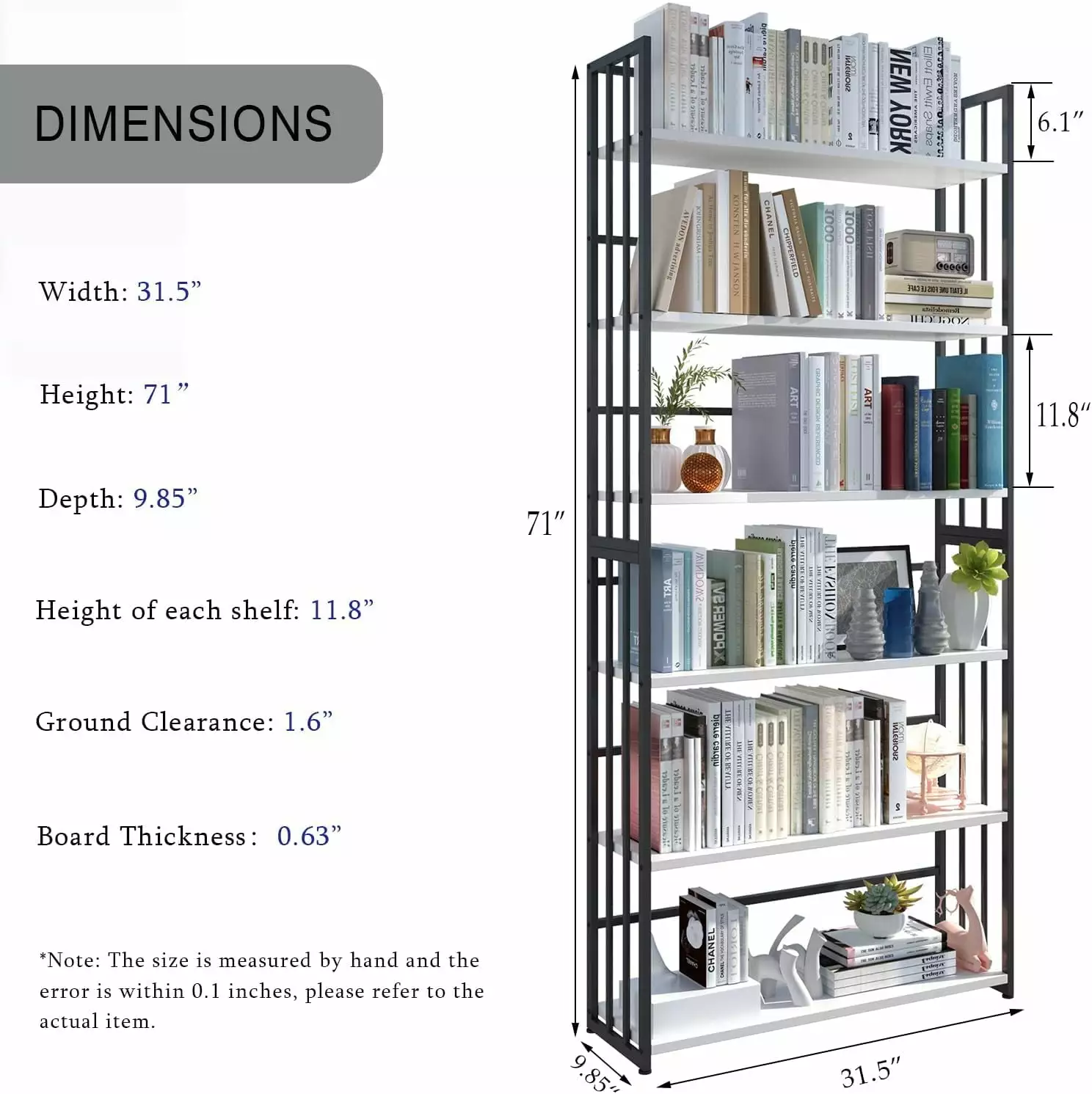 - SPECIAL DESIGN – The bookshelf has a three-sided fence designed to keep books upright and keep items from falling. The 9.85-inch depth. 11.8-inch height between each shelf. 6 tiers design ensures ample storage space;