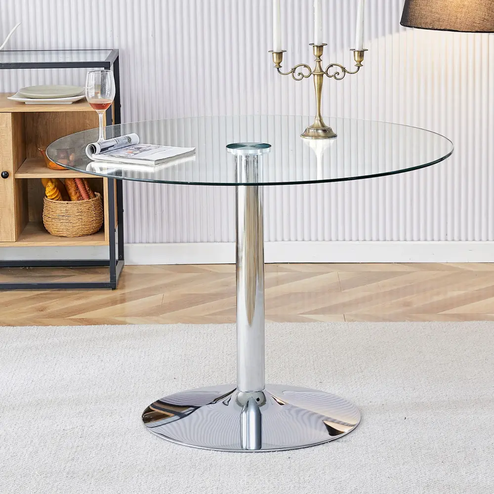 Modern Minimalist Circular Dining Table With Glass Top And Electroplated Steel Legs For Restaurants And Living Rooms – Silver / Transparent