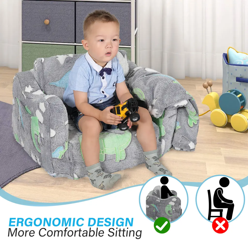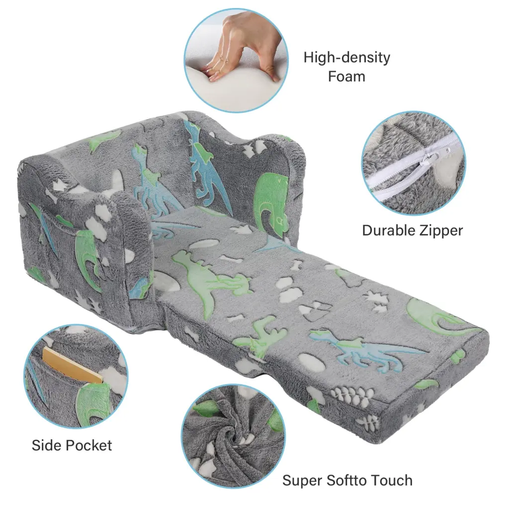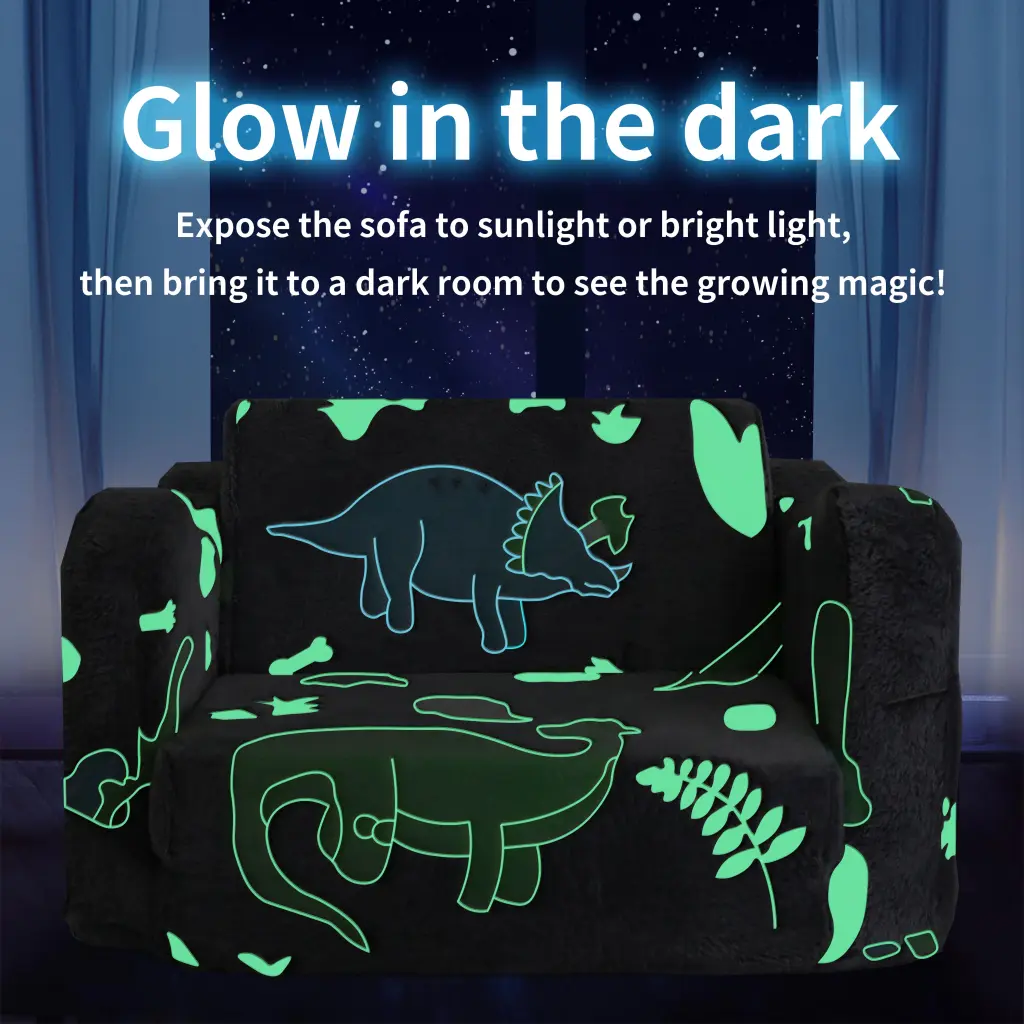 - **Glow-in-the-Dark Sofa** Features a green dinosaur pattern with a unique glowing design. Simply place the toddler sofa under bright light or sunlight for 10 to 15 minutes. Come evening. you will be able to witness the magical light as the intensity of the glow in the dark increases with its level of brightness.