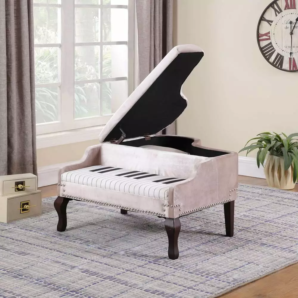 For most buyers the quality of the upholstery and construction are of greatest importance in selecting a piece of furniture. This Beige Grand Piano storage ottoman is a large piece of furniture that tends to become the focal point of whatever room it is placed in. This is especially true of grands. Add to that the fact that you’ll be looking at it for many years to come. and it becomes obvious that appearance can be an important consideration. We are re-inventing the piano as a piece of a modern furniture. Piano are meant to flourish in glorious. expansive settings. For some buyers. it may be the most important consideration. Filled with silver nailhead accent trim adorned on the bottom edge of the piano ottoman bench. Upholstered seating with ivory piano keyboard design. our grand piano storage ottoman helps you neatly store blankets. books. bulky winter wear and more. Find a place for everything with the help of this storage ottoman bench. 2 pcs Cherry Queen Anne wooden legs in the front and 3 pcs Cherry Tapered Legs from behind ensure sturdy support and resilience. Inside the ottoman bench comes with a single hinged lid. an open storage compartment holds everything from board games to blankets. helping you to organize your space. This multitasking piece brings style. seating and storage to any room in your home.