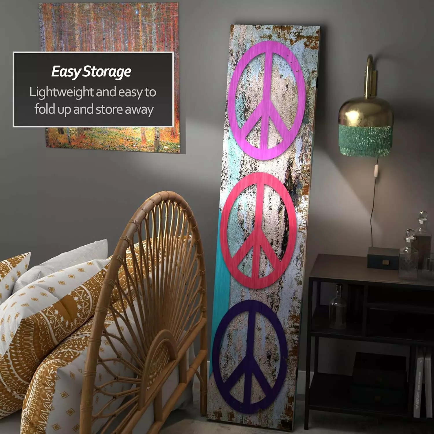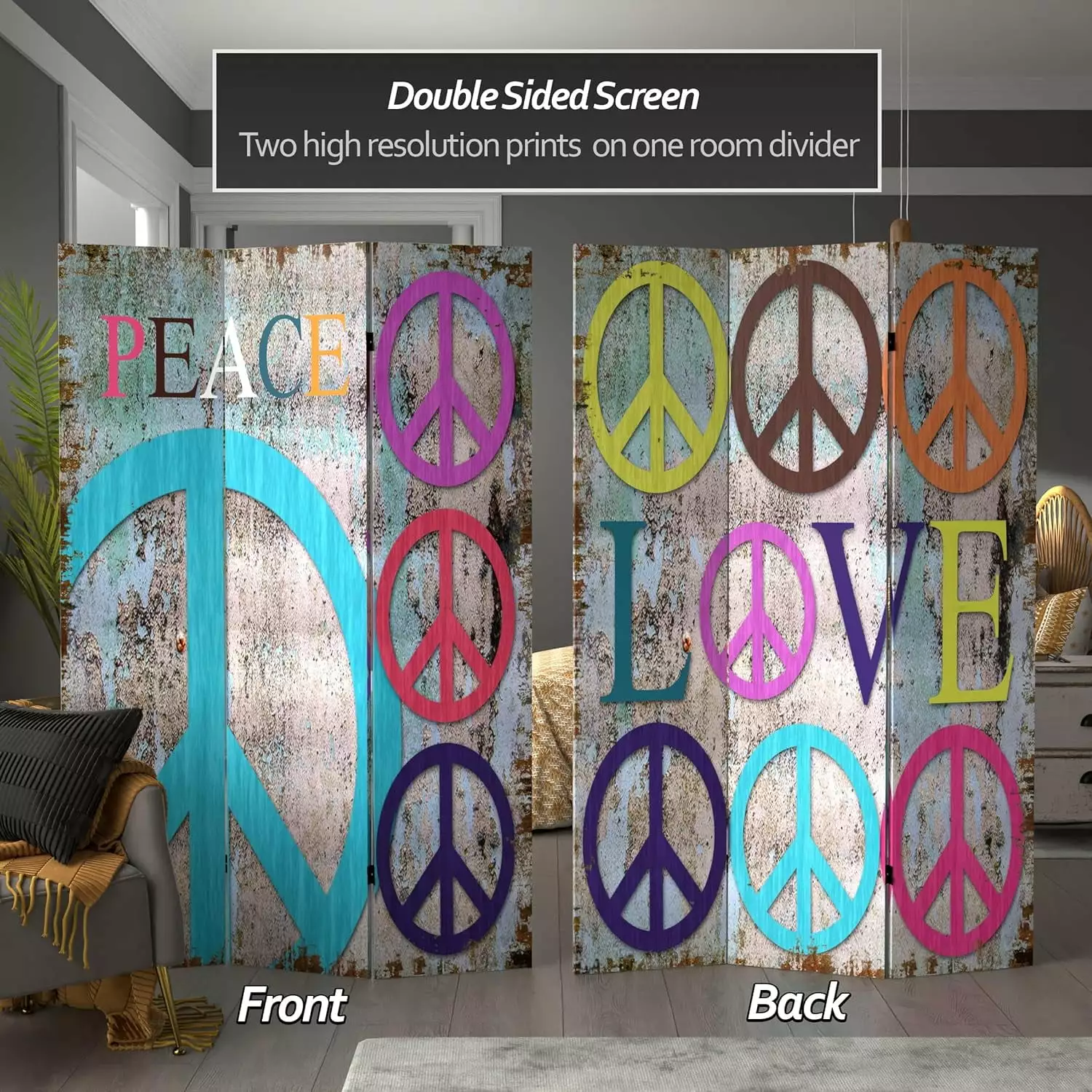Kitsch collage of art graphics depicting peace and love in counter culture designs reminiscent of Andy Warhol. Twiggy. and the scene. Vibrant prints on six foot tall panels provide a practical folding screen for privacy. blocking light. dividing and defining space. or screening a messy work area. Great for dorm rooms. art studios or rec rooms.