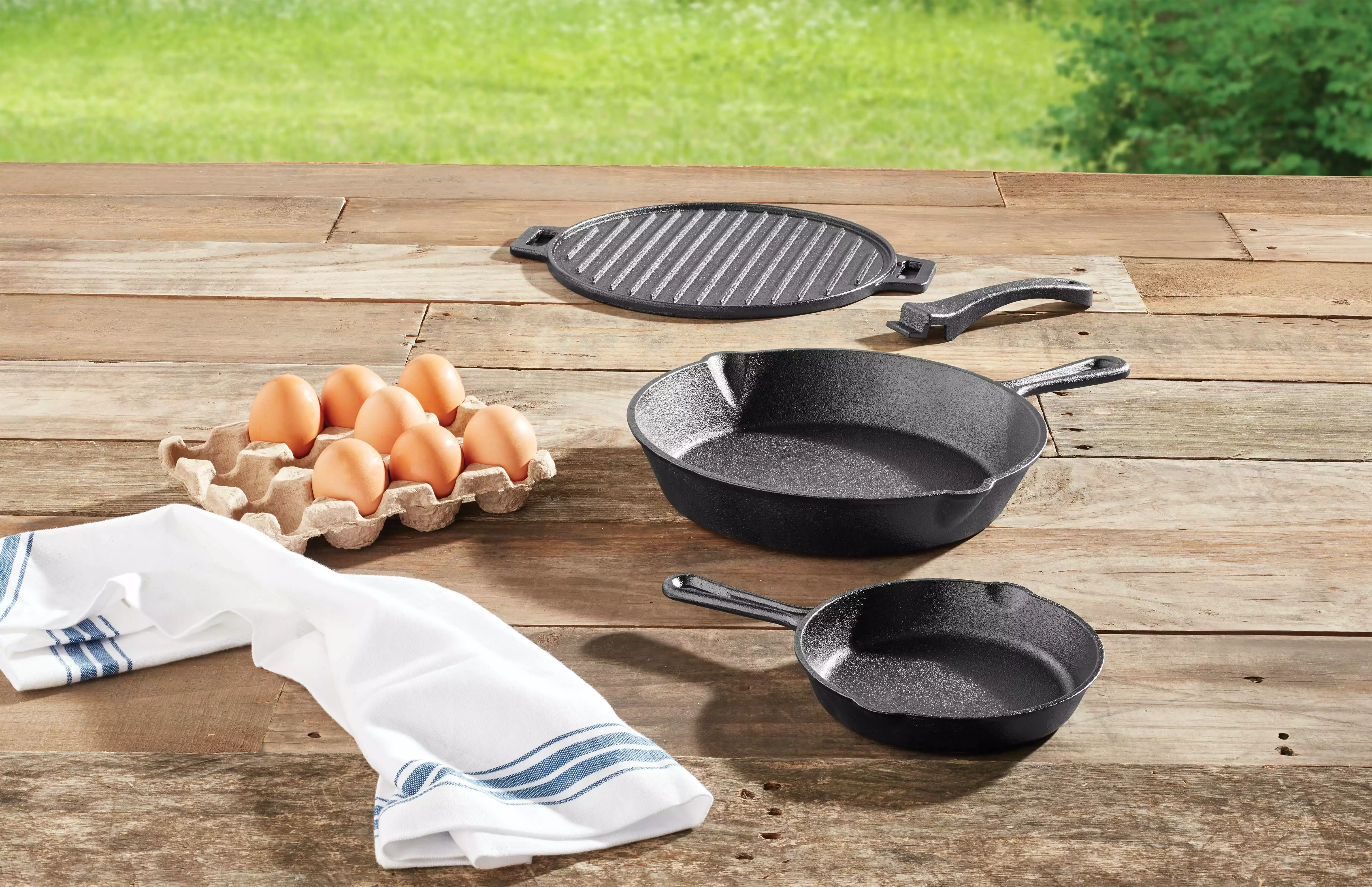 The Ozark Trail 4 Piece Cast Iron Skillet and Griddle Set is made of durable cast iron that will last for generations. Bake. broil. fry and stew your favorite meal. enjoying a unique and hearty flavor. These skillets feature an easy pour lip on the side and a loop on the handle. making them easy to hang up on a hook after use. The griddle includes a removable handle for easy storage. a true space saver! All cookware pieces are pre-seasoned with natural plant oil for a superior cooking surface. With the Ozark Trail 4 Piece Cast Iron Skillet Set. you will have the versatility to create any meal for any size group. Adventure is where memories are made. whether it’s campouts in the back yard with the kids. Saturdays at the river with friends. or a week in the wilderness alone. Ozark Trail helps you and your family create everyday adventures with gear and accessories built with you in mind. From backpacks to tents. they’re rugged. dependable. and priced to be practical. Because adventure is not a destination; it’s a lifestyle.