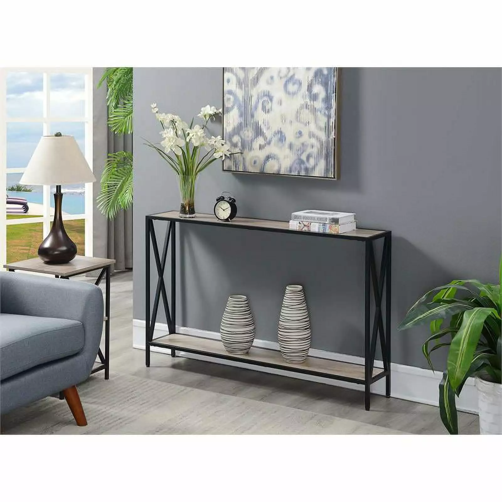 The Pemberly Row Console Table in Brown Wood Finish is a great addition to any home. Available in multiple finishes and black cross frame. it is sure to complement any home decor. Featuring generous top surface and bottom shelf that provides plenty of space to display collectibles or every day necessities with ease of access. The stylish crossbar designed legs provide a contemporary aesthetic to a classic. versatile piece. Whether you use it in the living room or any other room it will be sure to make a statement.