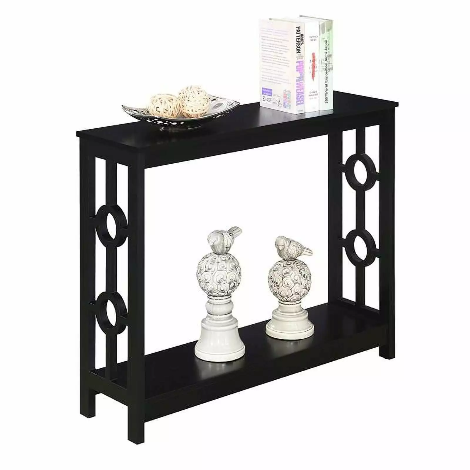 Spruce up the essence of your living room with the Console Table by Pemberly Row today! This distinctive contemporary piece showcases a well thought out design that combines a clean line silhouette and two circles that adorn each of the side frames. Crafted with durable materials to become a staple in your home. The top and bottom shelves are fashioned from particle board that is finished with a non lead based paint and melamine; making them easy to maintainch The frame design and legs were constructed from MDF and finished with a non lead based paint. With ample shelves; this two tier unit will satisfy your display and storage needs. Exhibit all your most beloved collections or books with pride; as this accent table is stylish and ideal for any type of mementos. With endless versatility this item can be placed anywhere; from hallways to your home office; it will fill the room with style. Add it to your ensemble today and enjoy its simple assembly that is worth every step!