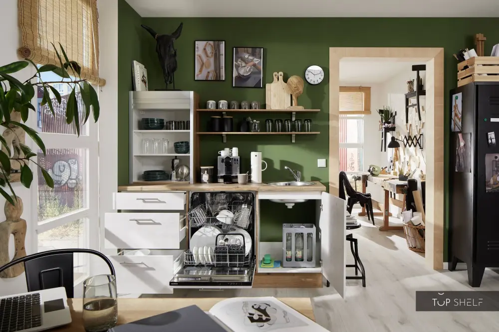 The thoroughly pre-assembled Pino kitchen consists of a kitchen unit with a total length of 1.80 m | 180 cm. The fitted kitchen includes a sink cabinet, a base cabinet, a top cabinet, two wall shelves, and a dishwasher front with door front for fully integrated dishwasher. The kitchens are delivered right with the matching built-in appliances from the manufacturer Zanker.