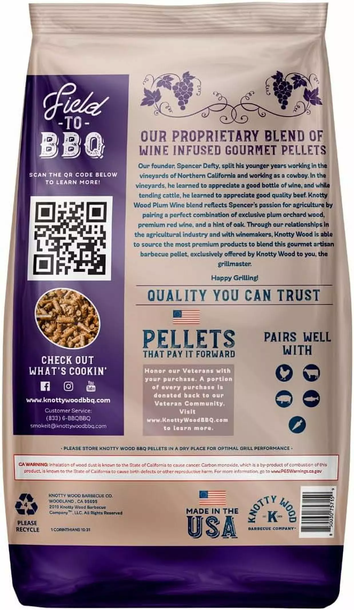 Plum Cabernet Wine Blend Pellets are 100% natural. made only with real flavor and a lot of care. Started in a backward in Woodland. California. owns the entire production process from field to BBQ. ensuring superior quality. These pellets are made using plum wood bark because the bark produces more heat and flavor. With a high density. the pellets also boast a 20% longer burn time than lower-density pellets. This sweet and smoky blend is infused with premium red wine that’ll elevate the flavor of any meat of your choice.