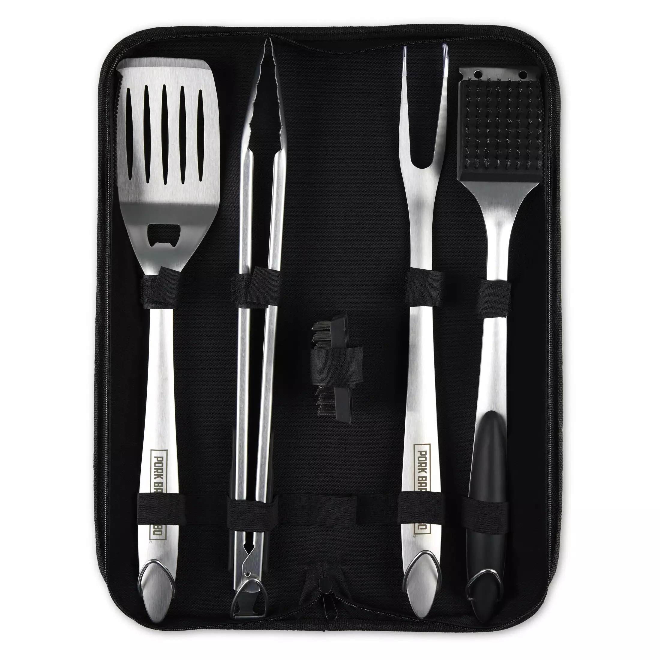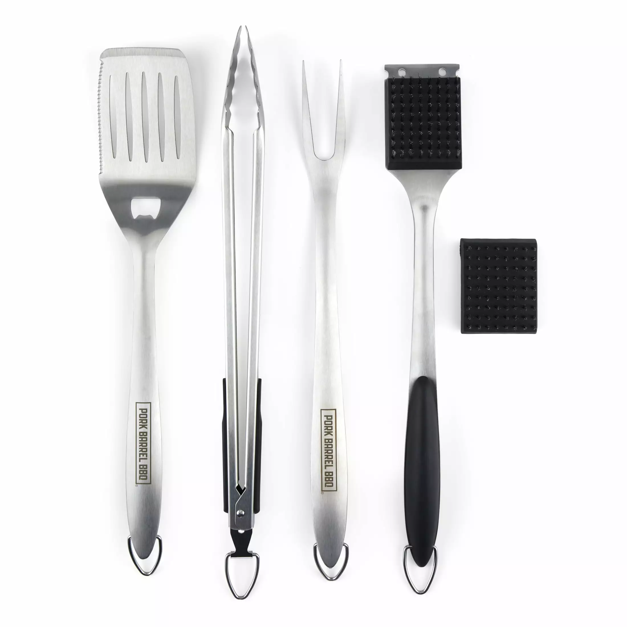 - COMPLETE GRILL SET: This Pork Barrel BBQ Tool Set includes a stainless steel spatula. fork. bbq tongs. grill cleaning brush and replacement bbq brush head in a carrying case.