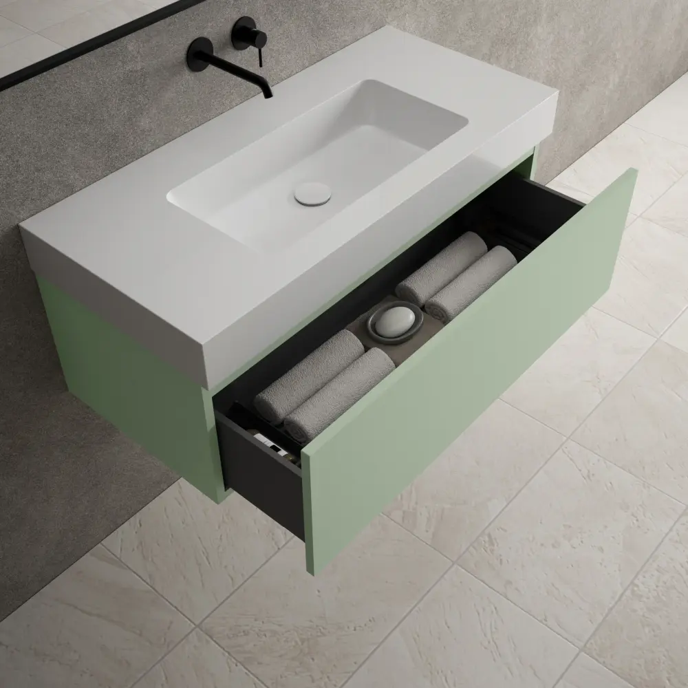 Raffinata One Drawer Vanity Unit Beyondstone BLOC Basin - Matt Buoyant Green 1000mmRaffinata One Drawer Vanity Unit With Beyondstone BLOC Basin – Matt Buoyant Green 1000mm