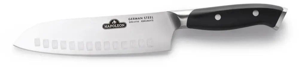 Napoleon’s Santoku Knife is a beautiful, multi-purpose knife that is ideal for chopping, slicing, cutting, and mincing. The 7-inch blade features a Granton edge – dimples or scallops that allow for smooth cutting so food doesn’t stick – and a double-sided bevel to the blade for more refined slicing. This knife has a broad face with a sizable spine that curves down to meet the tip making it ideal for prep work and moving food from the cutting board to the pot. A Santoku knife is smaller than a chef’s knife making it lighter and easier to handle for those with smaller hands as well. Ideal for everyday use, a Santoku Knife is impeccable for your culinary arsenal.