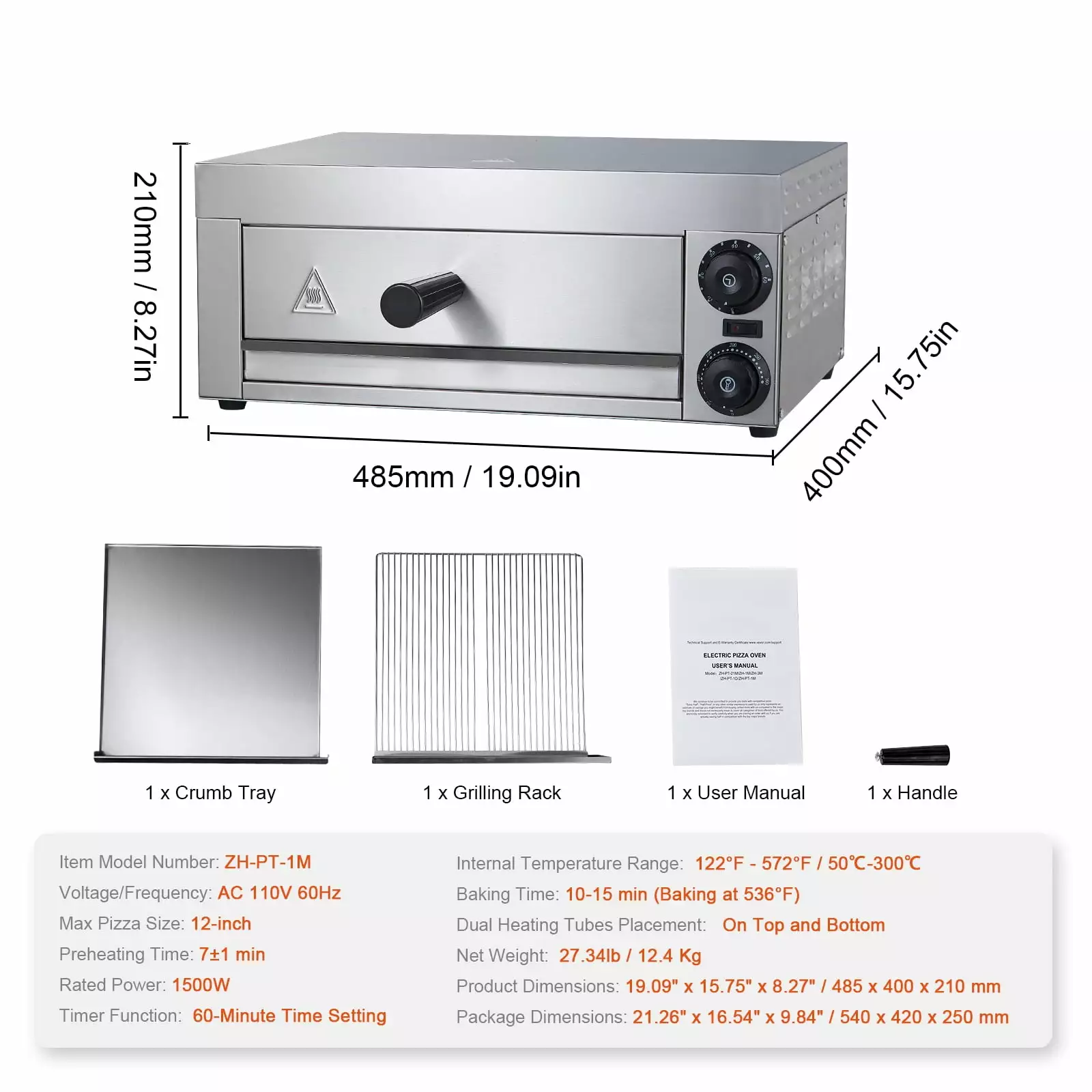 Item Model Number: ZH-PT-1M Voltage/Frequency: AC 110V 60Hz Max Pizza Size: 12-inch Preheating Time: 7 1 min Rated Power: 1500W Internal Temperature Range: 122 F – 572 F / 50 -300 Baking Time: 10-15 min (Baking at 536 F) Timer Function: 60-Minute Time Setting Dual Heating Tubes Placement: On Top and Bottom Control Knobs: 2 Knob Control (1 temp control knob 1 timer knob) Main Material (Exterior): 0.025 / 0.657mm 201 Stainless Steel Main Material (Interior ): 0.025 / 0.657mm Aluminum Plated Panel