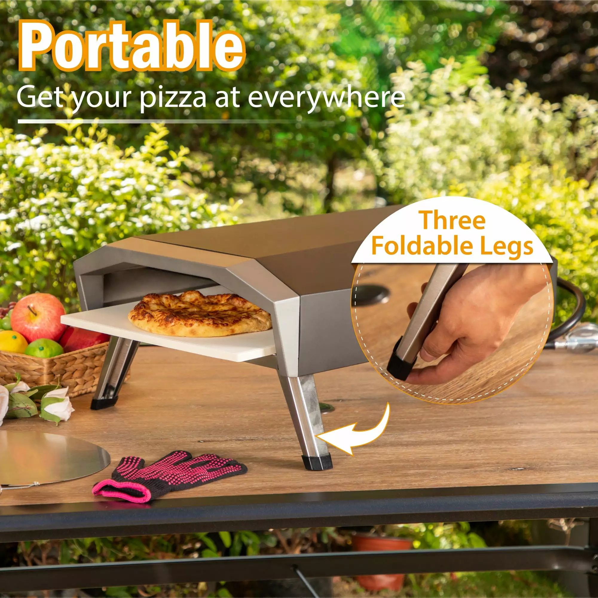 - Compact Portable Design: The durable and lightweight pizza oven is equipped with folding legs. and can be easily assembled without tools. It can also be quickly disassembled and put in a cover for easy storage. ideal for backyard or outdoor cooking activities.