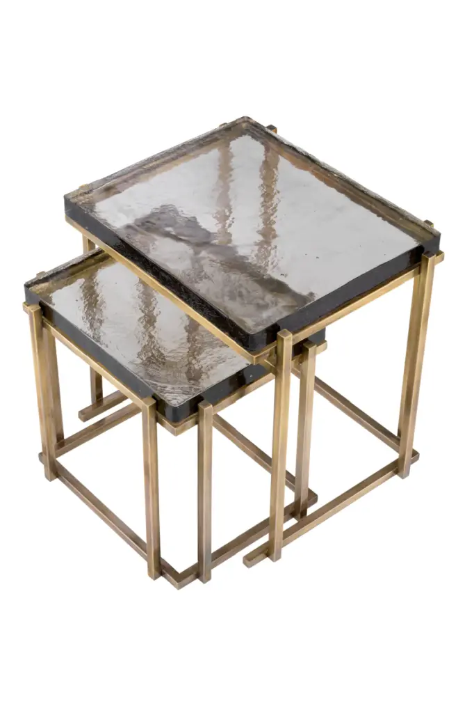 The Niemeyer Side Table set is a beautiful pair of two tables featuring a vintage brass finish and thick, handcrafted glass tabletops. Each piece of glass is unique and individually handcrafted, ensuring that each table has its own character and appeal. Whether used separately or nested together, the versatile set allows you to create a variety of configurations to suit your needs.?