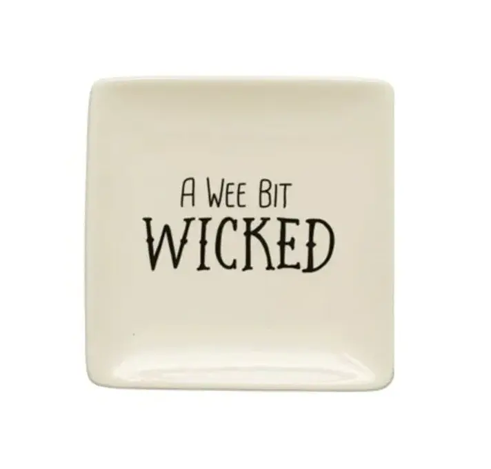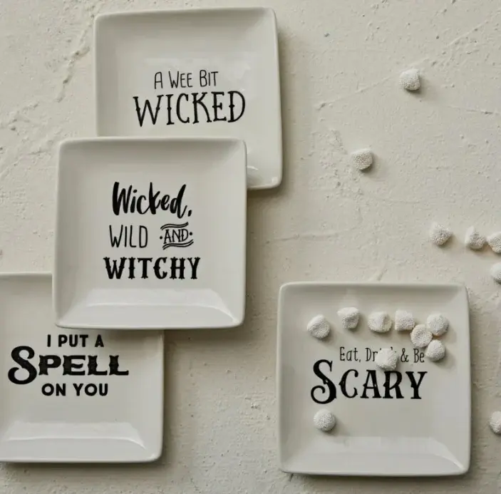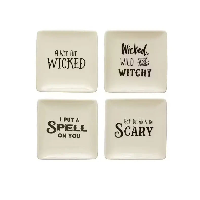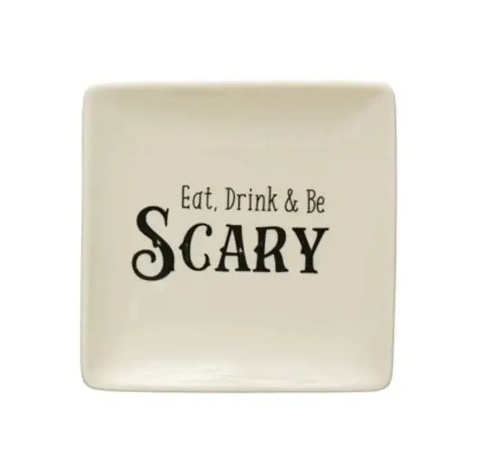 5″ Square Stoneware Plate w/ Spooky Saying, Cream Color & Black