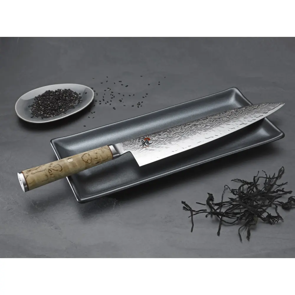 Top-of-the-line MIYABI Birchwood is a work of culinary art. Both blade and handle are crafted from the most precious materials, which shape their striking appearance.More than meets the eye, the potent core of SG2 micro-carbide powder steel is protected by 100 layers of stainless. MIYABI’s innovative, ice-hardening process locks in the long-lasting sharpness of the CRYODUR blades. Beneath its beautiful exterior, the flower Damascus pattern provides added durability.The scalpel-like blade is complemented by an equally striking Karelian (Masur) Birch handle. A prized material for knife handles, Karelian Birch is also the only wood ever used in a Faberge egg. Exquisite and contoured, MIYABI Birchwood knives feel as good as they look.