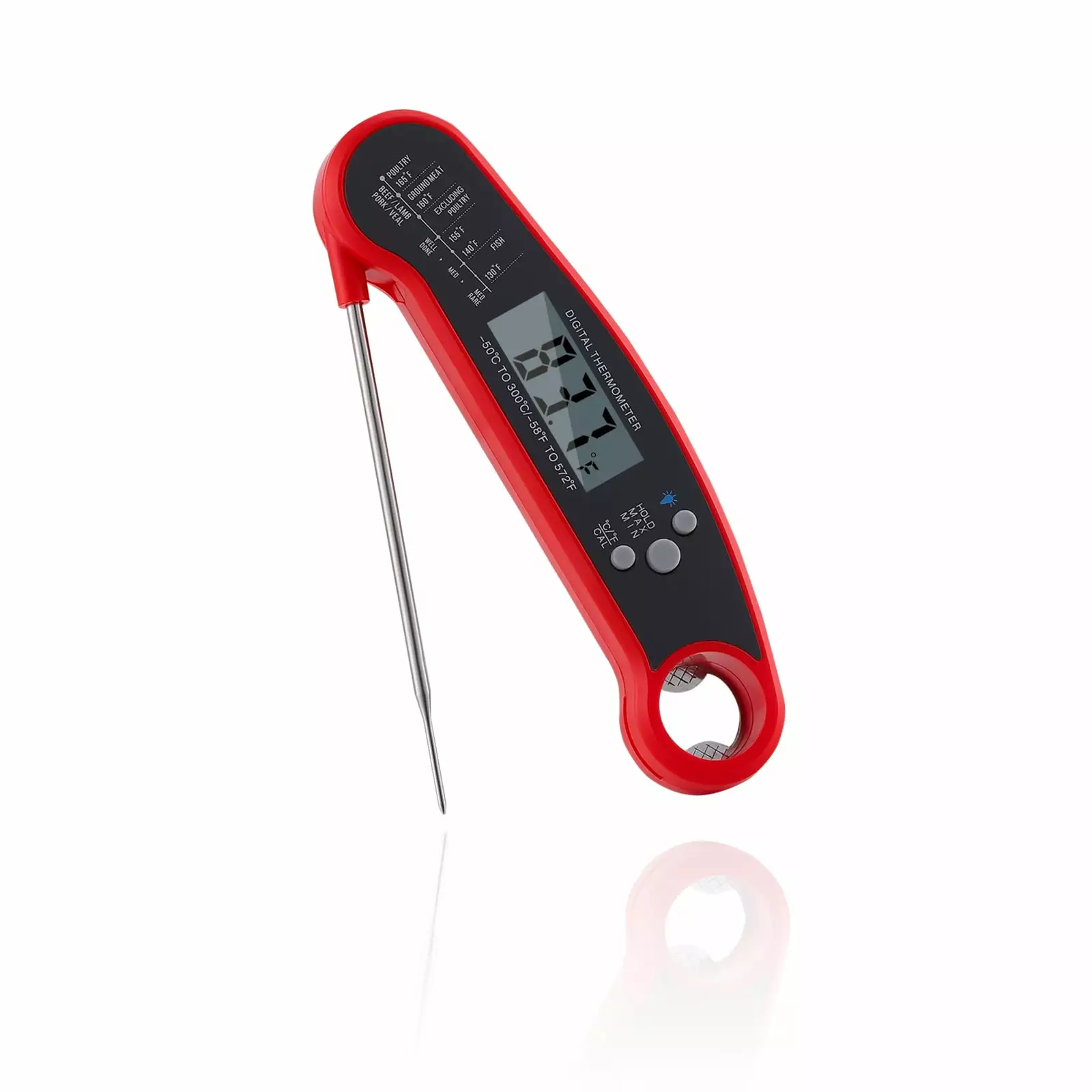 This folding Stainless Steel probe thermometer is compact for easy storage. The large 0.60 display has a blue backlight for easy readability. Probe is thin at the end to maintain essential juices from escaping food.