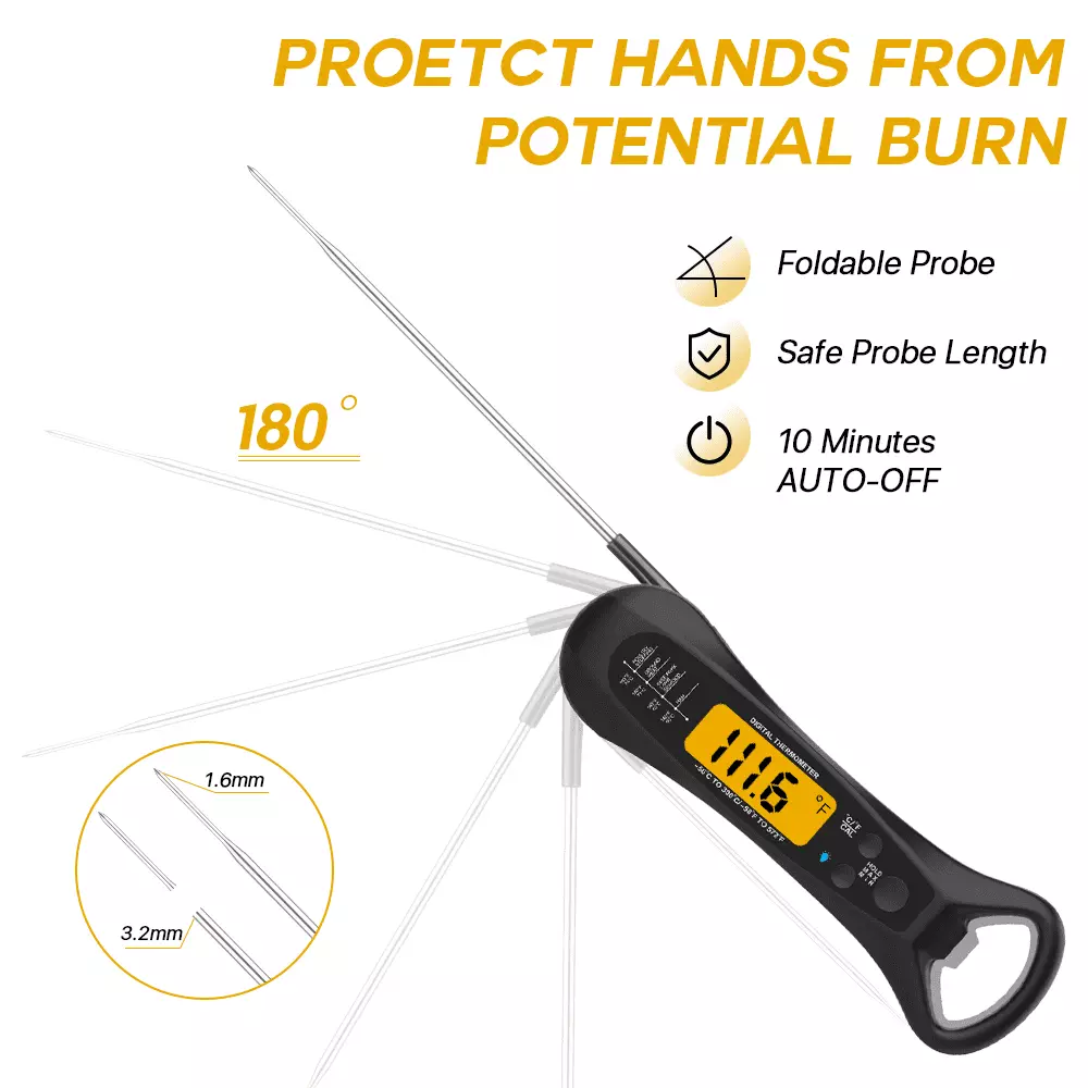 SUPTREE digital meat thermometer with probe for grilling is an effective solution to achieve the most accurate temperature in a matter of seconds. The digital kitchen thermometer with a simplistic yet practical design that the foldaway probe will quickly an easy temperature reading. and when you’re done taking the temperature measurement you can fold the probe back in to ensure the probe is kept safe and clean. Don’t sweat powering the food thermometer off as it’s designed to conserve battery power after 10 minutes of no use. The meat thermometer with a backlit LCD display. reading temperatures in your preferred unit of measurement between Celsius or Fahrenheit is a breeze. Stop overcooking or under-cooking your meat and perfect meat temperatures like a professional. ensuring the perfect temp every time you’re grilling or cooking!