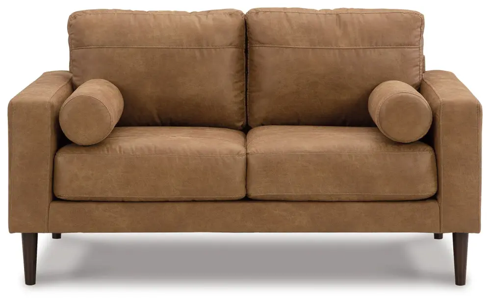 Small-scale style, tailored to perfection. This loveseat echoes classic aesthetics with warm caramel faux leather, while its ultra-linear silhouette incorporates a contemporary edge. Versatile in form and function, the seat suits styles from modern boho to transitional. And its size helps you to confidently curate your compact space without sacrificing comfort (or your budget).