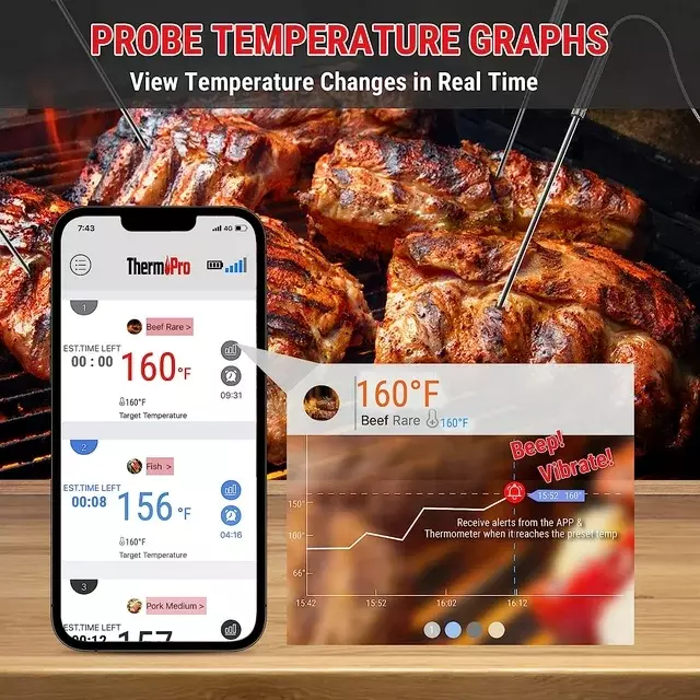 ThermoPro Truly Wireless Bluetooth Grill Thermometer Bundle The ThermoPro Smart Bluetooth Truly Wireless Grill Thermometer Bundle includes ThermoPros latest grill thermometer technology the TempSpike. Monitor your cooking from 360 feet by using the most stable Bluetooth frequency available on the market. Equipped with a pair of advanced heat sensors this digital meat thermometer can track cooking temperatures both inside and outside your food. Enjoy 100% wire-free cooking and the convenience of no-hassle setup. As the smart choice that edges out the competition it is a must-have for ovens grills sous vide BBQs smokers rotisseries and more. With a bonus TP01HW instant-read included for quick readings in tight spots.ThermoPro Truly Wireless Bluetooth Grill Thermometer Bundle