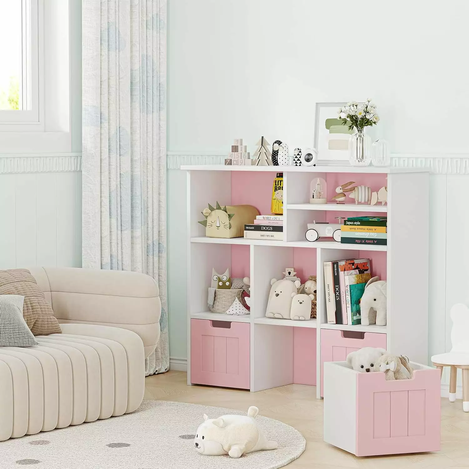 Kids toy storage cabinet adopts rounded corner design to increase safety.