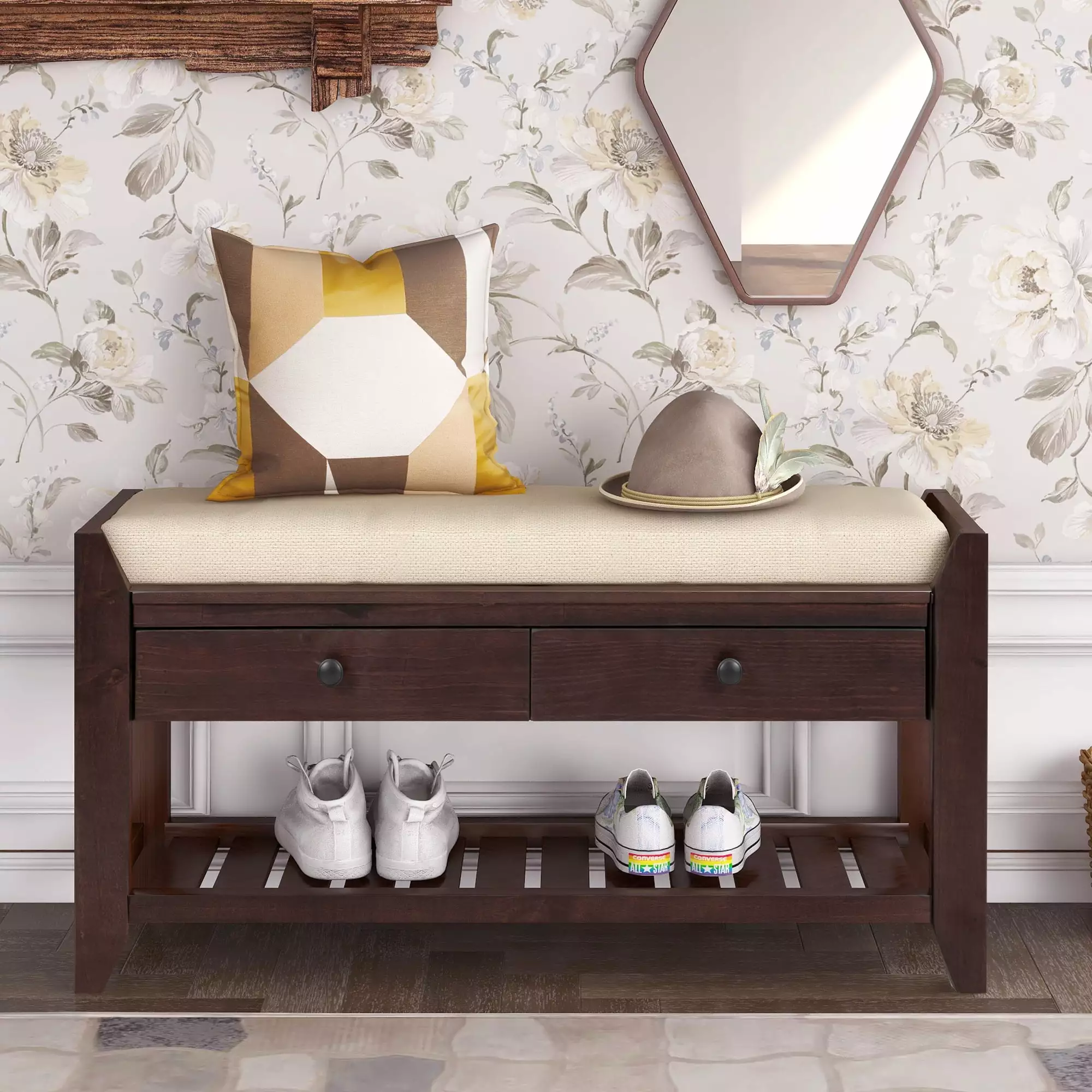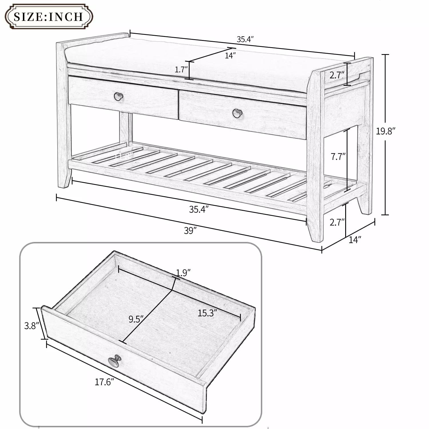 Storage Solution Ideal for family use.this classic bench functions as the perfect inconspicuous storage option to tastefully store your personal belongings. Two spacious sliding drawers sit directly underneath the upper bench seating area giving you easy access while the underside gridded rack can hold additional shoes or storage baskets Functional & Compact With a spacious upper seating deck. it is fitted perfectly with a soft beige cushion that can be further customized with decorative throw pillows.With 5 colors to choose from. The carefully crafted silhouette emphasizes classic details. including tapered legs and a gridded base shoe rack with dual upper storage drawers fitted with matte black powder coated knobs. Details Material Pine wood top. bottom shelf and legs;MDF drawers Weight Capacity Top shelf: 220 LBS; Bottom shelf: 66 LBS; Drawer: 17 LBS Drawer Interior Dimensions 15.3"L x 9.5"W x 1.9"H Finish Distressed finish Finished Back Yes Package Number 1 Assembly Required 30 min Additional Tools Required All tools included Maintenance & Notice About Finish Liquids should be immediately blotted with a damp cloth. Do not use surface cleaners that could remove the finish. About Hardware Hardware may loosen over time; periodically check to make sure all connections are tight. About Fasteners Don’t over-tighten fasteners. as this may cause distortion or breakage. About Color Real Product’s Color may be a little different from the image due to the lighting or monitor’s display. About Size Manual measurement has been used. there may be some reasonable error.