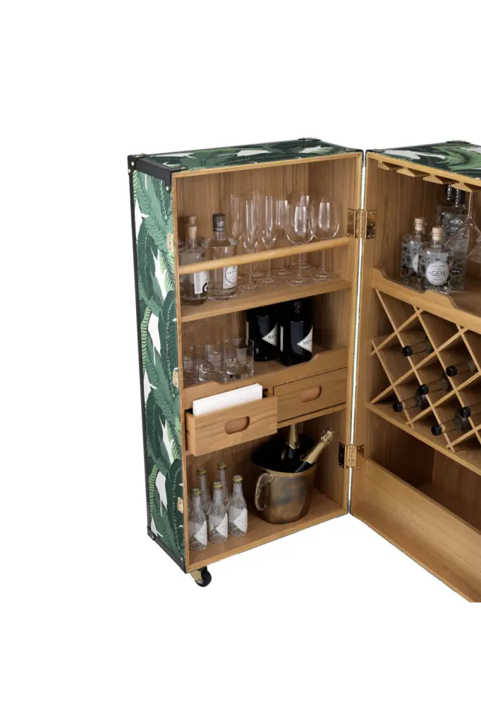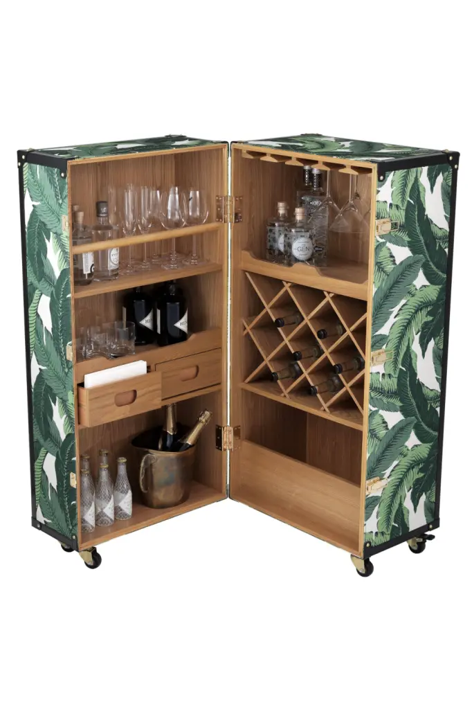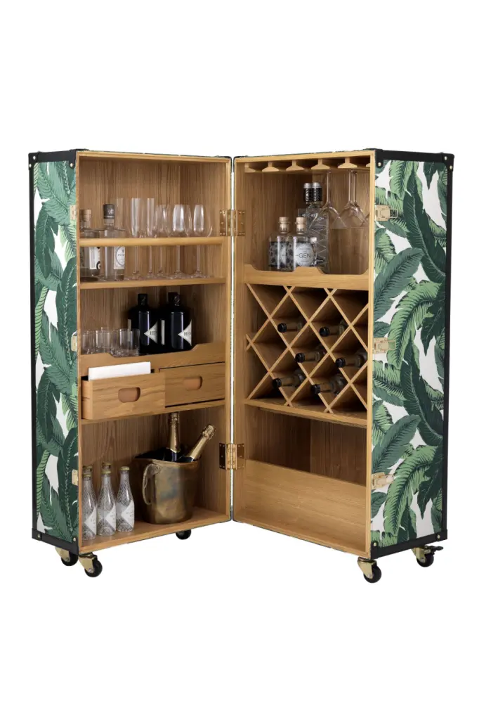 Botanical style meets vintage glamour in the Martini Bianco Wine Cabinet. Inspired by antique campaign drinks cabinets, this elegant cocktail cabinet offers an integral top section glass holder, a storage rack for wine bottles, five open shelves and two drawers. Featuring a Mustique green fabric upholstery with a beautiful banana leaf pattern, the cabinet is finished with black leather look straps and gold colored hardware. Castor wheels add to the retro look.