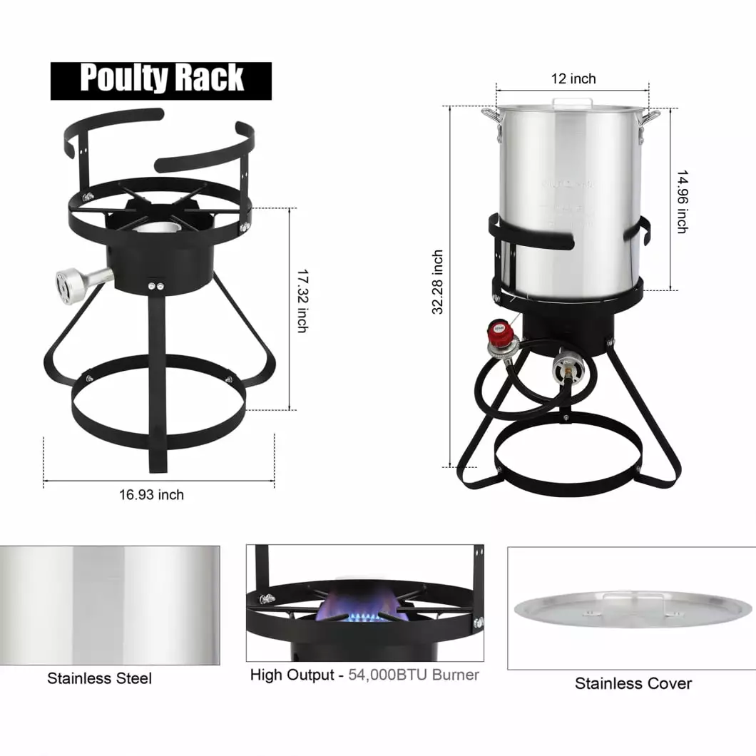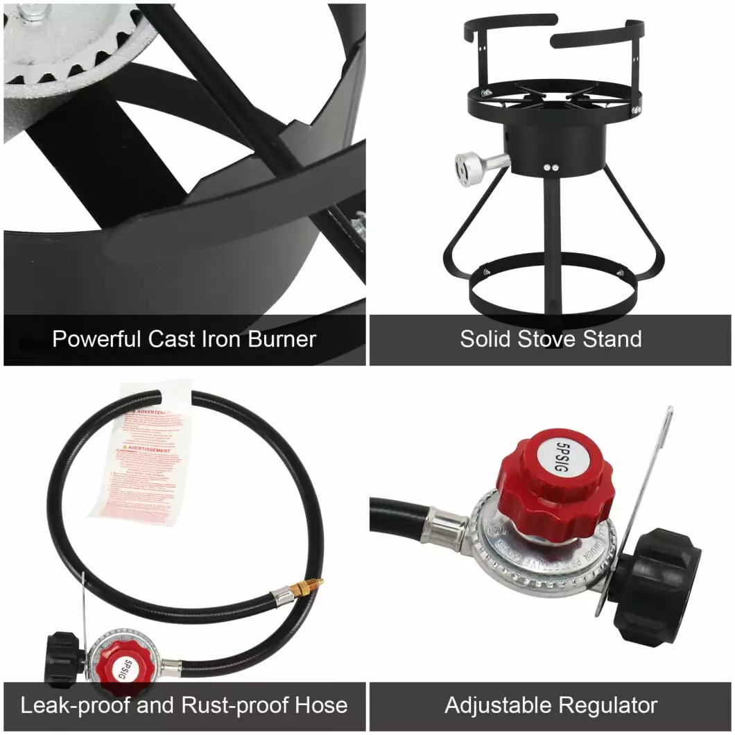 - 54000 BTU HEAT OUTPUT: The turkey fryer & fish fryer kit comes with a cast iron burner that can deliver max. 54000 BTU heat output. which can help fry food fast and evenly. And the propane burner includes a 10PSI CSA certified regulator for adjusting gas flow.