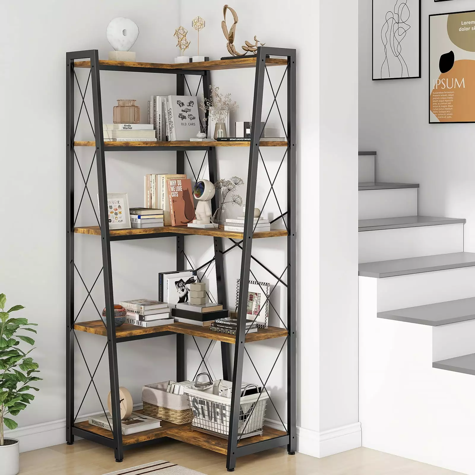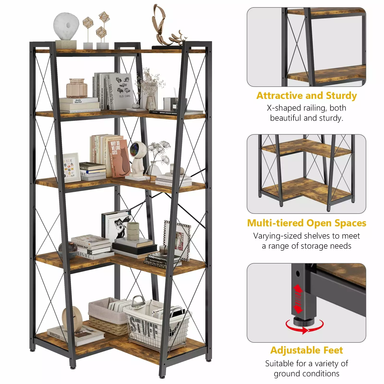 Vabches Industrial Bookcases and Bookshelves offer 5 tiers of storage space with 10 open shelves in a corner bookcase design. This L-shaped shelf is supported by a sturdy metal frame. providing open storage solutions suitable for the living room. home office. or study.