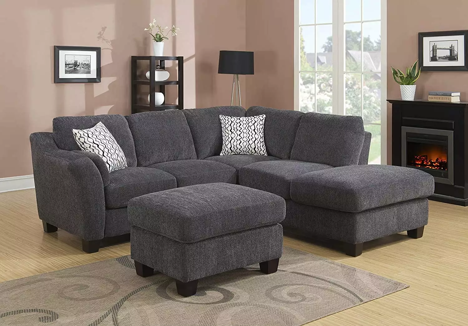 The Dyer is a highly versatile and comfortable contemporary sectional with a variety of features. The 100% polyester textured Chenille cover has a soft. plush feel. Pocketed seat coils in the cushions and sinuous springs provide comfort and lasting durability. The frame is solid wood-encased. which ensures a quality tailored appearance and prevents fabric from stretching. The Clayton also has fixed seats and seat-backs for maximum support and a luxurious seating experience. and comes with two accent pillows. Blind-stitching and tapered wood feet add to the charm. The versatile Clayton ottoman can be turned sideways against the sectional and serve as an additional chaise.