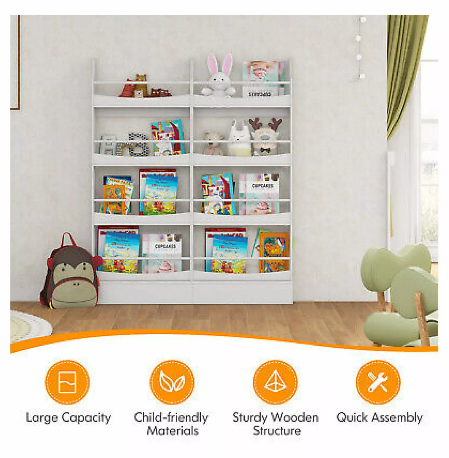 - Number of Items in Set:One-Piece.Features:Keep Books Organized within Little Ones Reach.Safe & Sweet.Mounting: Standing.Assembly Required:Yes.Department:Kids.Model:Does not apply.Original/Reproduction:Original.Packaging:Yes.Assembly Status:Assembly Required