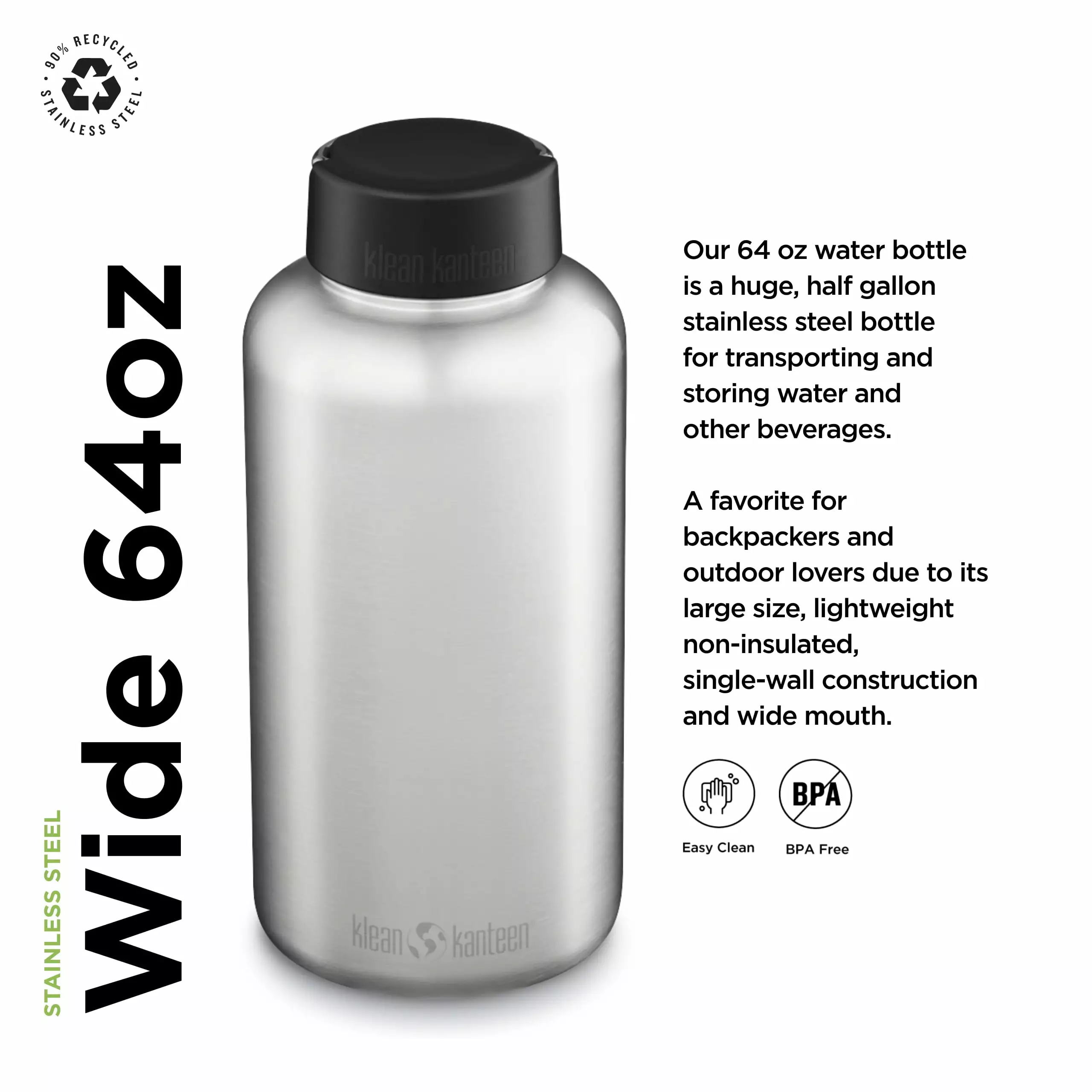 New look. same great performance. We know better than to mess with a classic (too much). We updated our single-wall wide collection with fresh colors and a brand-new easy-carry cap while keeping all the features you love. Lightweight and compatible with most backcountry water filters. this bottle is a favorite of adventurers everywhere. The extra wide mouth is easy to fill with ice. too. Made from certified 90% post-consumer recycled 18/8 stainless steel and designed for easy cleaning. carrying. and chugging. the single wall wide is up for just about anything. Thanks to the chip-resistant Klean Kanteen coat finish and leakproof cap. you can toss it in your pack. crash pad. or pannier without a second thought. Check out our fresh take on an old favorite.