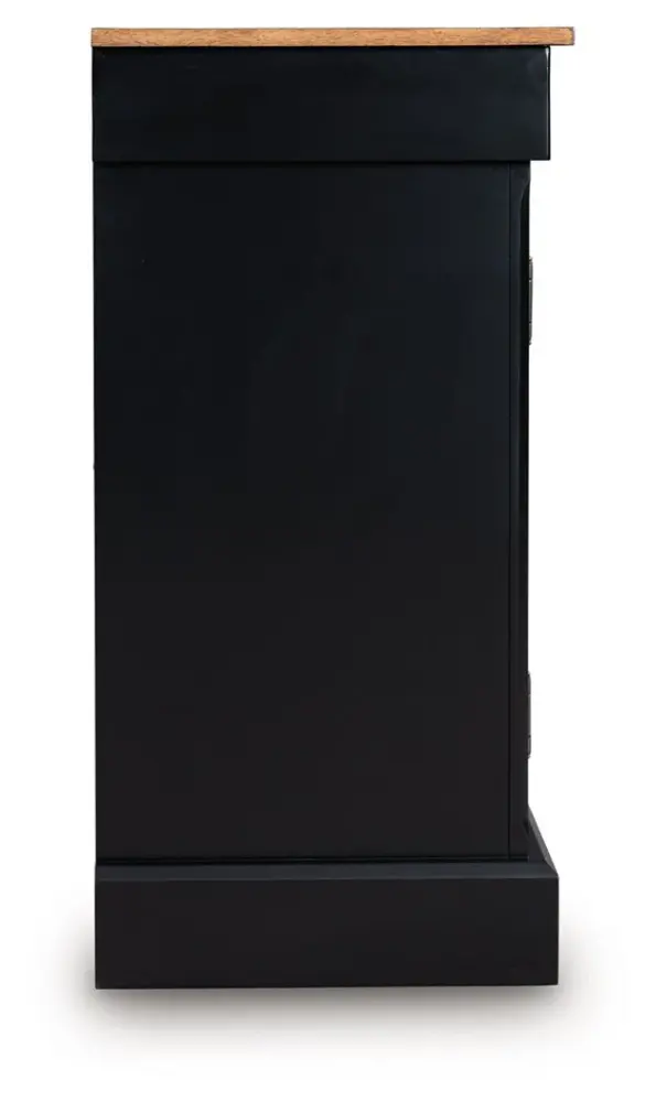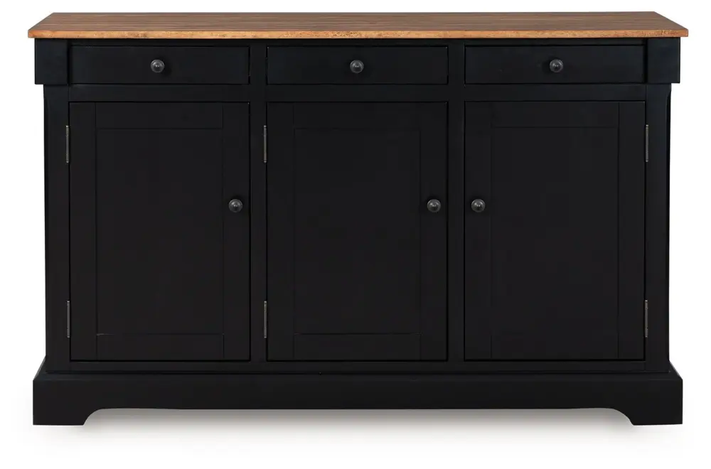 Raise the bar on modern farmhouse style with this dining buffet. Its handsome top-notch looks are accentuated with a two-tone finish and a casual butcher block veneer top. The sturdy silhouette adds a hearty element, whether your style is heritage, country or eclectic. Three drawers and three cabinets with adjustable shelves serve your entertaining needs well.