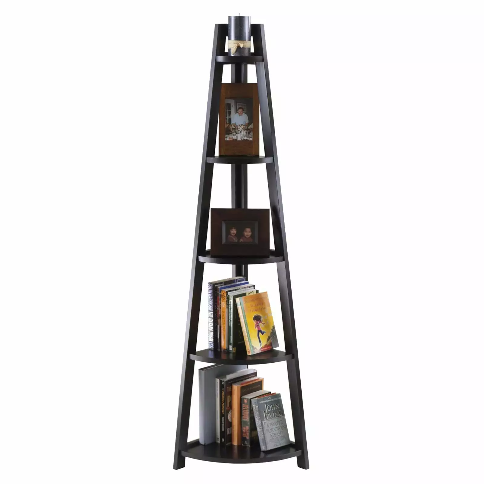 Display family photos. plants. and other knick-knacks with this unique Winsome Wood Adam 5-Tier A-Frame Corner Shelf. This five-shelf bookcase sports a trendy design and slim structure that allow it to blend with many decors and fit into tight spaces. Fits right in the corner of the room. flush against a wall while the front of the ladder-style bookcase slants outward towards the bottom. The shelves vary in size for each. decreasing towards the top making it resemble a ladder and exude an aesthetic visual appeal. Perfect for any corner of any room. office. a reception area. a study. a classroom. a living room. a bedroom. a dorm room. a den or a kitchen. With 12 clearance between each shelf. this open shelf is perfect for displaying family portraits and even trophies. Constructed of a combination of sturdy solid and composite wood. finished in black. Add the Winsome Wood Adam Shelf for a complete and unified space (each sold separately). Conveniently packed and shipped in 1 box. that includes the hardware necessary for assembling. Replacement part request can be submitted directly to the manufacturer within 60 days from date of purchase.