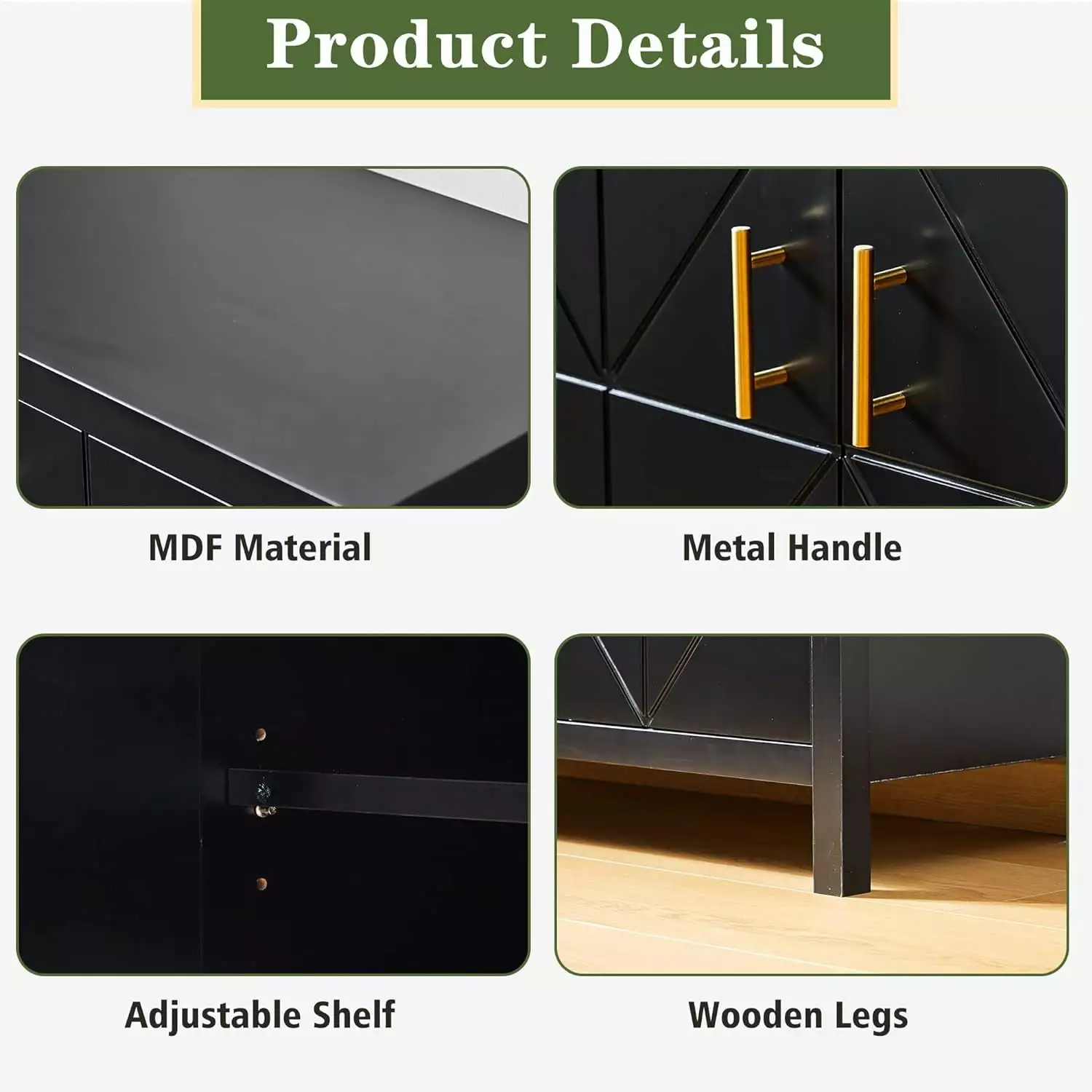 - **Quality MDF Material** Equipped with sturdy wood legs that can bear the weight of itself and the placed objects without shaking at all. The storage buffet storage cabinet is made of high quality MDF Board. it is durable. scratch resistantand long service life.