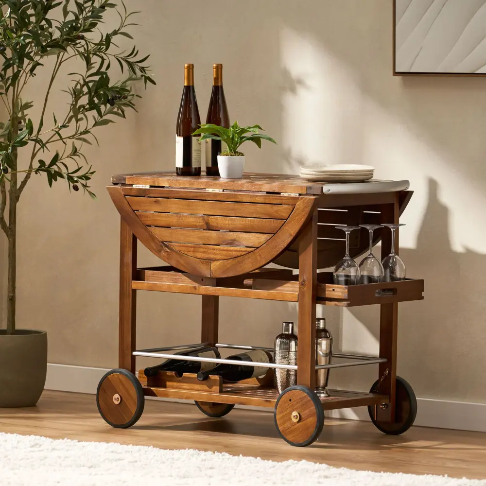 - Drop Leaf Design and Wheels: The cart’s top boasts a stowable double-hinged leaf design for space-saving convenience, while the back wheels come with locking pins to ensure stability during use, providing both functionality and practicality.