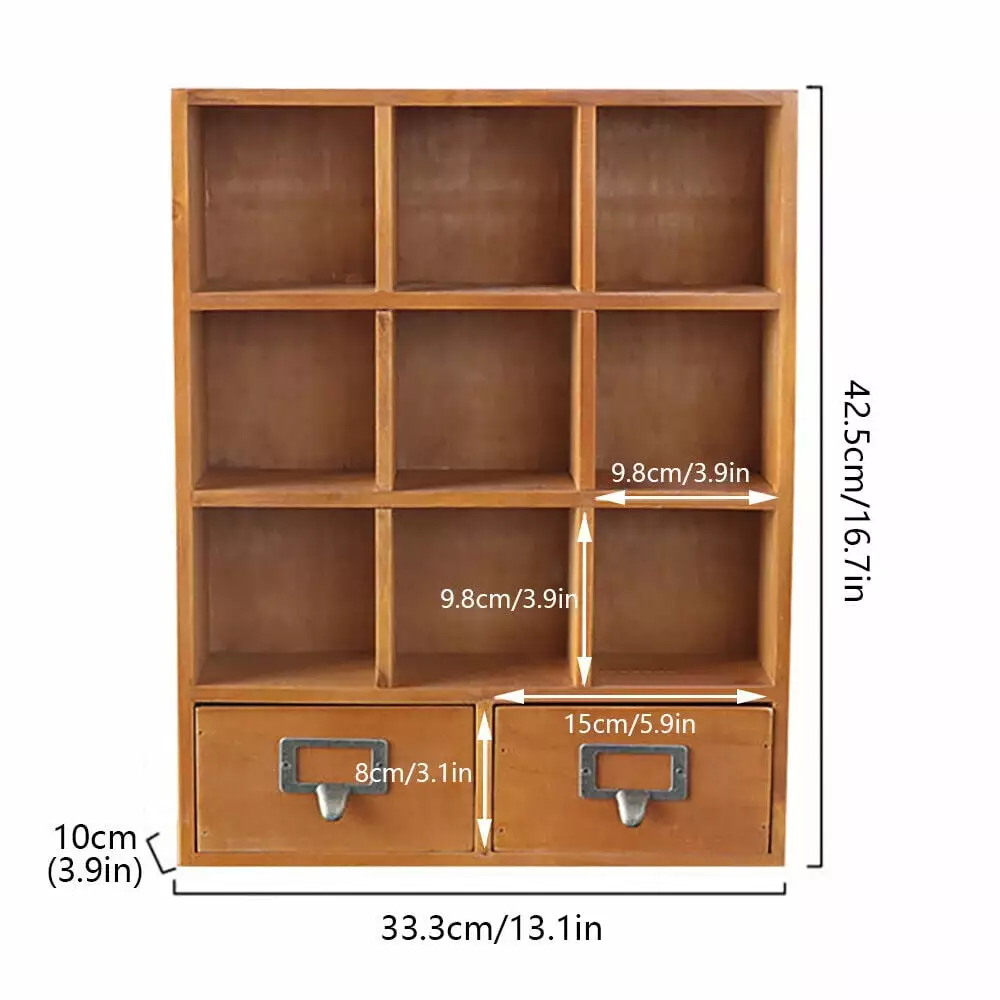 -Brown Pine Wood 9 Cube Box Curio Shelf with 2 Drawers Gift Keepsakes Display