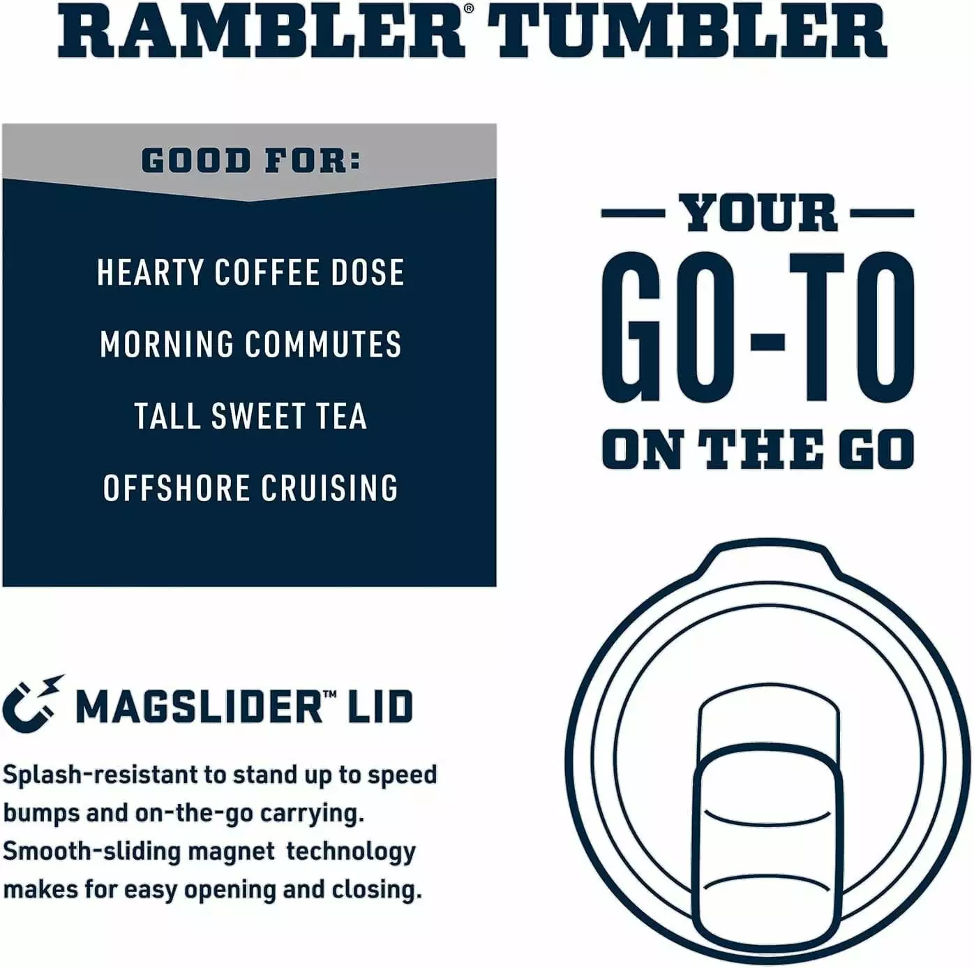 These Ramblers come standard with the YETI MagSlider Lid. the only drink lid that uses the power of magnets to keep your water. beer. or favorite drink on lock