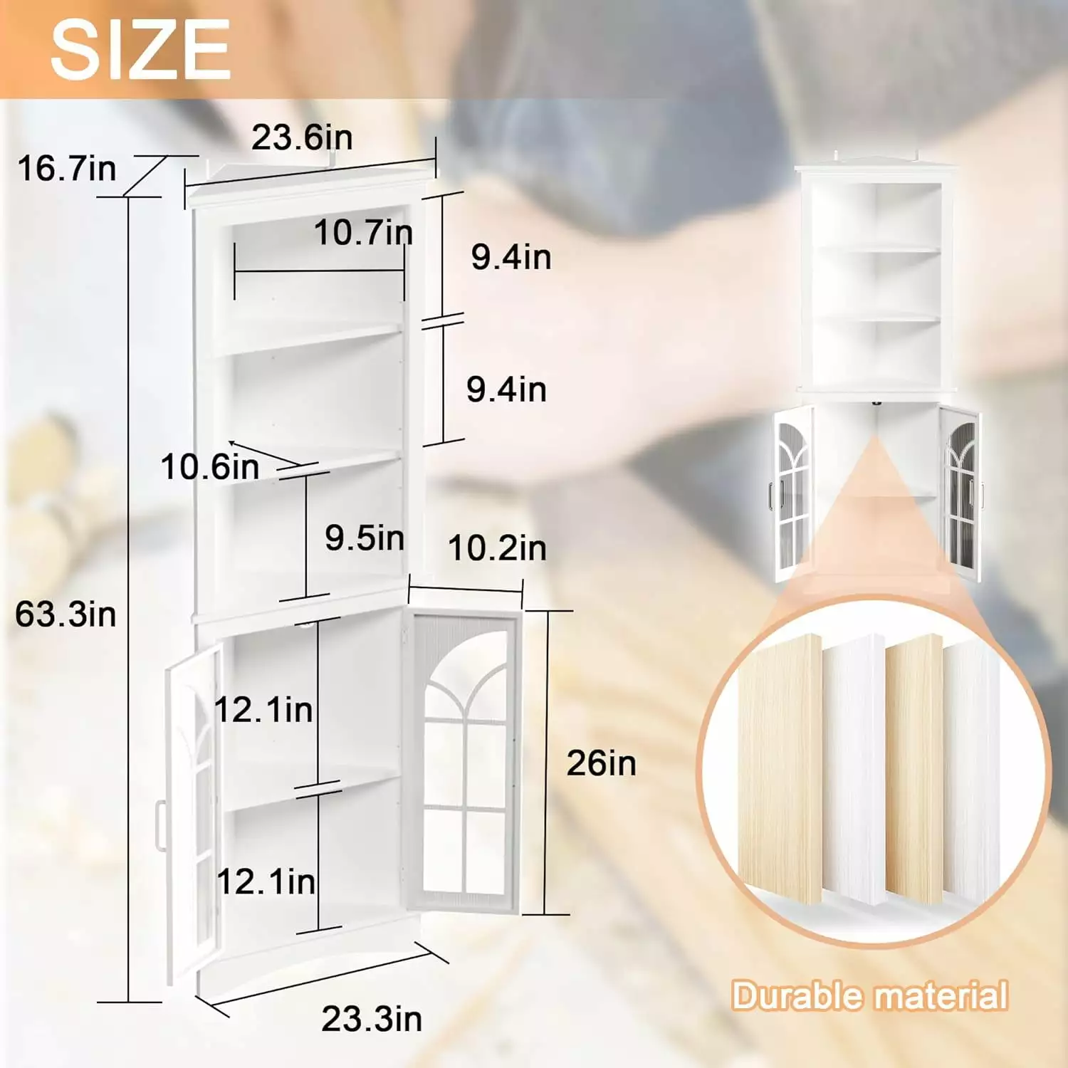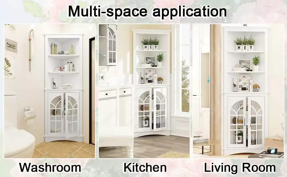 corner cabinet maximizes the expanded storage space. Tall corner cabinet with 3-tier open shelves & 1 adjustable board inside door freely storage for displays necessaries. and sundries.