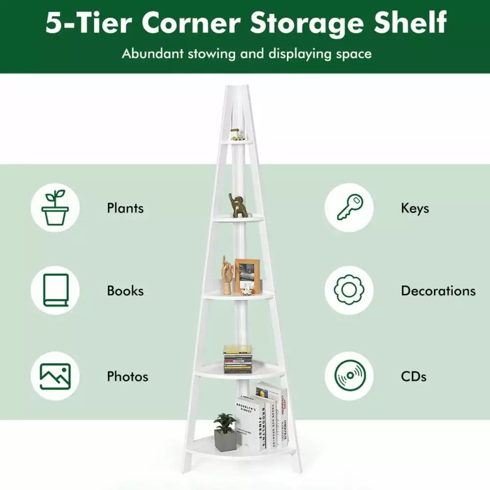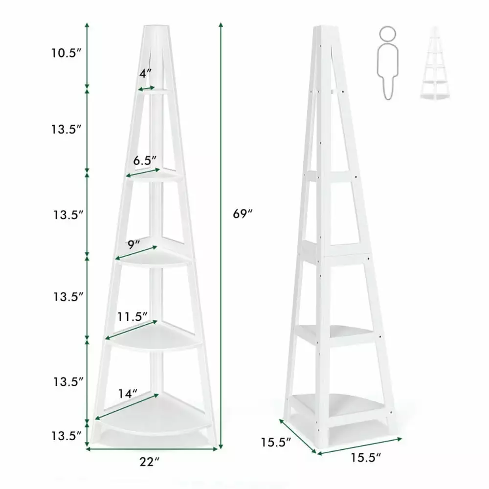 This 5-tier corner storage shelf has abundant stowing and displaying space for your photo frame remote CDs and more. And the ladder design makes it easy for you to reach your items. The compact structure with a right-angle design seamlessly fits into the corner of your room and saves your places. With anti-tipping devices this 70-inch-tall corner shelf gives you reassured safety. It is an ideal storage shelf bathroom shelf plant stand book shelf and more guaranteeing a multifunctional design and maintaining the style. You can have your room organized and tidy with this 5-tier corner ladder shelf. If you are looking for a corner storage shelf like this do not hesitate to place an order! A narrow and tall size with 90right-angle is suitable for a small corner and nook. Elegant design is a perfect match for the living room bedroom balcony and more. Multifunctional storage shelf works as plant stand small bookcase and more Easy to assemble with detailed instructions and clearly labeled parts Anti-tipping device mounts the corner shelf against the wall to ensure stability and safety. With 5-layer generous storage options for classifying and displaying personal items Quality ensured by the durable MDF board