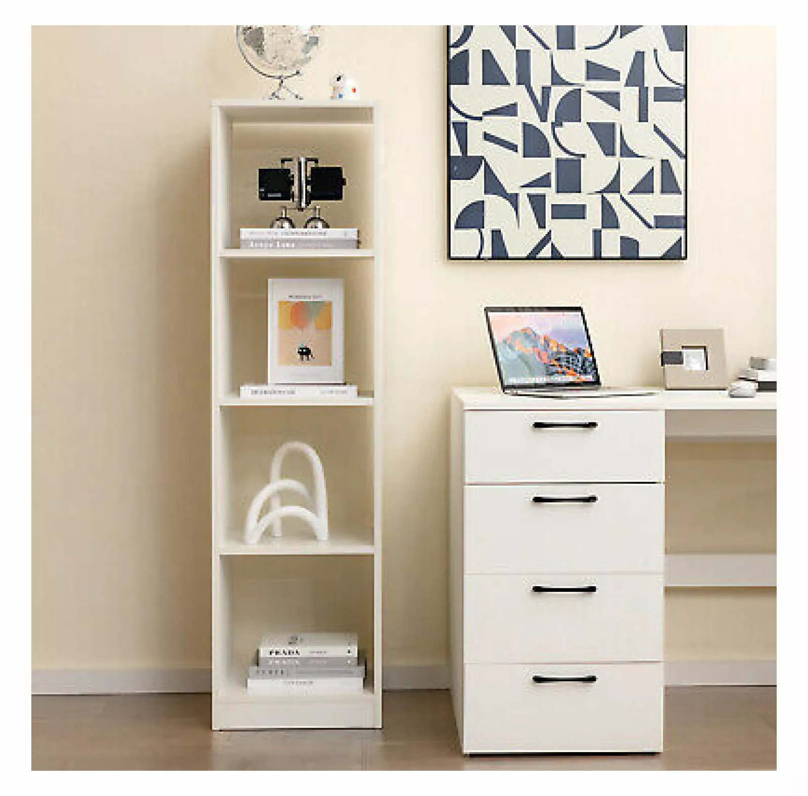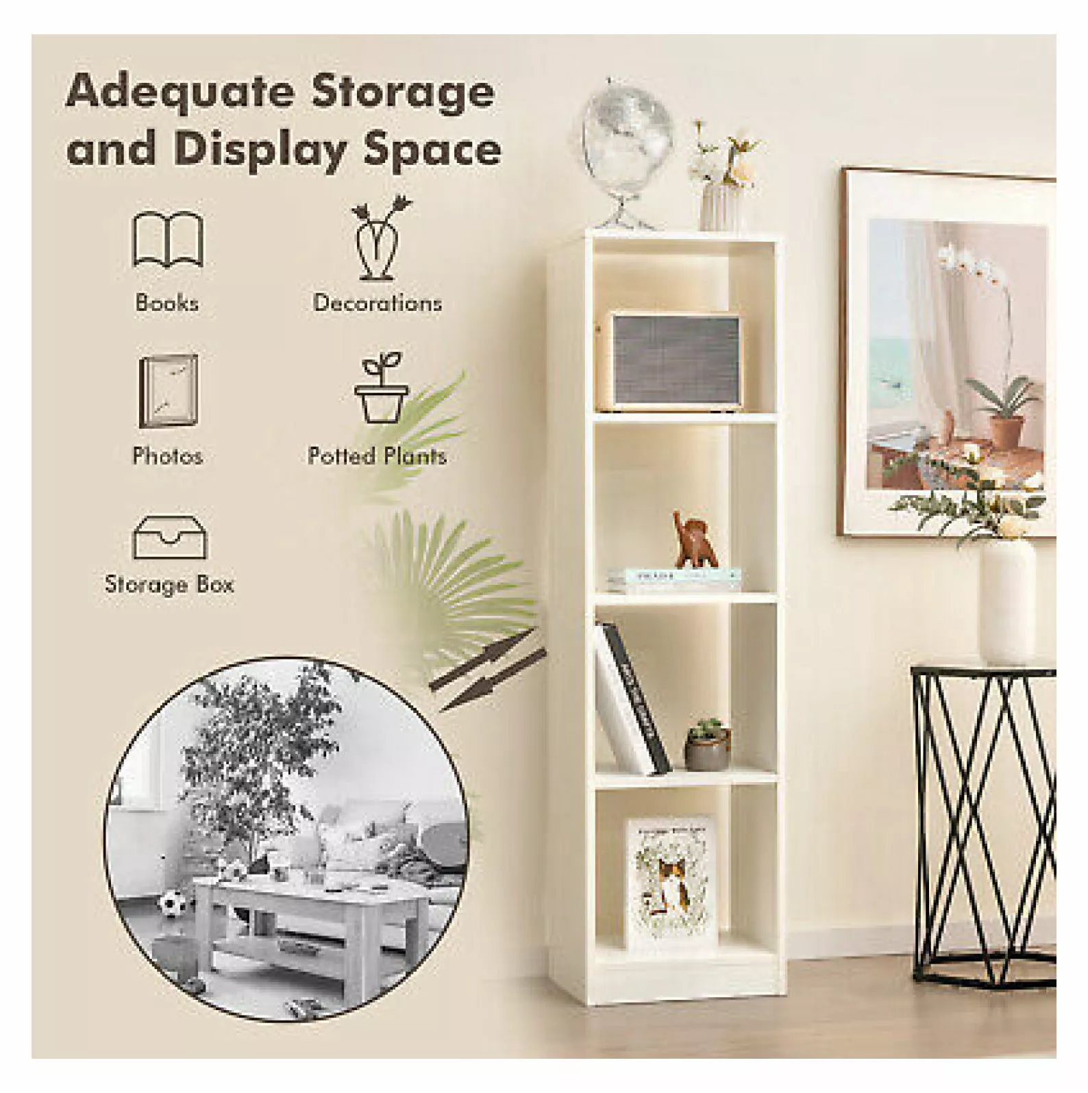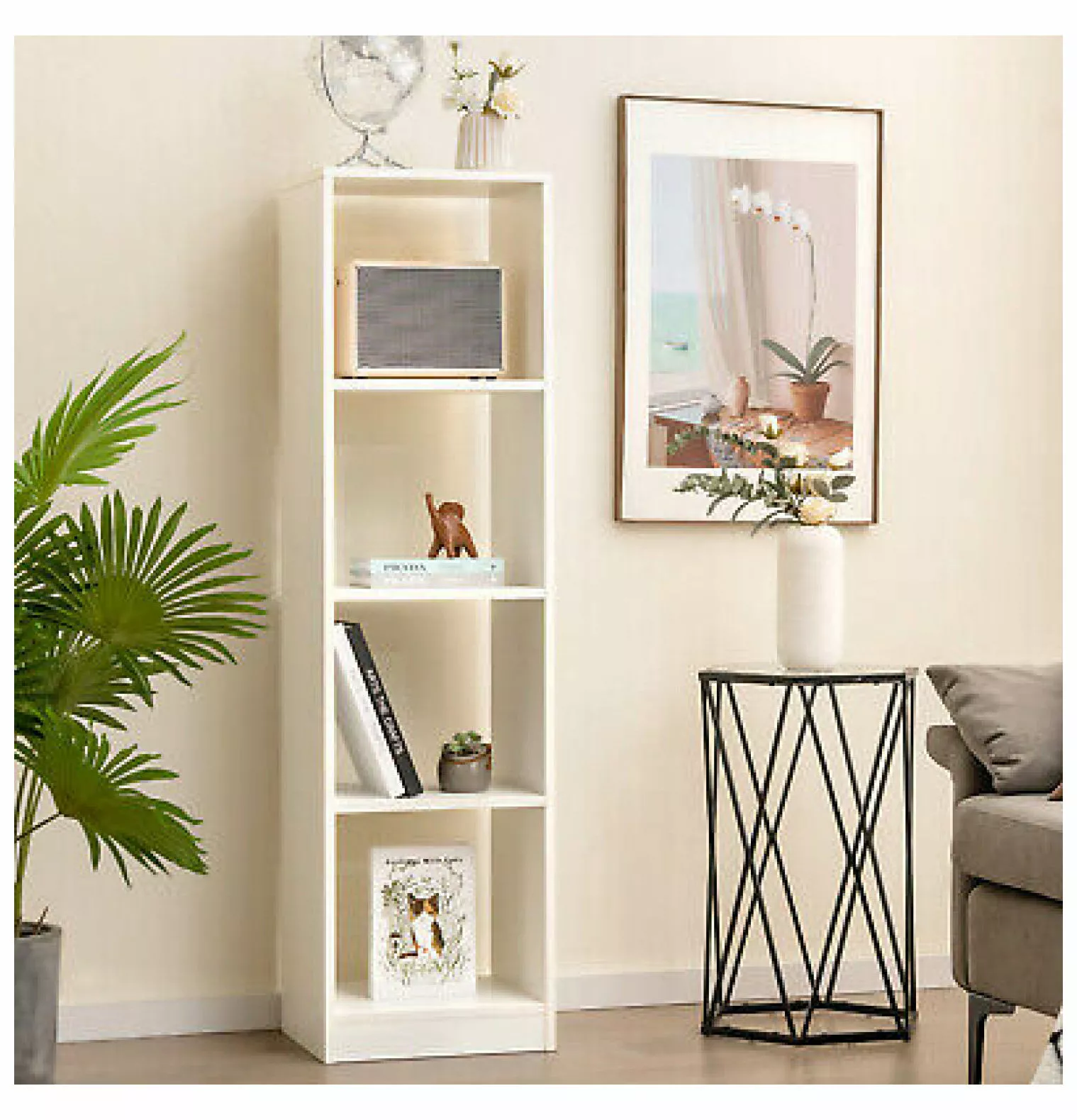 Color: White Material: Engineered Wood Overall Dimensions: 15 x 13 x 56 (L x W x H) Dimensions of Each Cube: 13.5 x 13 x 12.5 (L x W x H) Baseboard Height: 3 Weight Capacity: 165 lbs Net Weight: 37.5 lbs Package Includes: 1 x 5-Tier Bookcase 1 x Instruction PRODUCT DETAILS: Description:Are you sick of the cluttered books but in lack of storage space Take a look at this narrow bookshelf! Featuring the appearance of 4 piled cubes. the bookcase with a relatively slim body is a good addition to expand the storage space in small rooms. Then. you will have place to show off your favorite books. albums and ornaments in a classified manner. What’s more. to enhance the stability. 4 anti-toppling devices are to fix the tall bookshelf to a solid wall. Meanwhile. are non-slip foot pads to improve stability and prevent leaving scratches on floor. Besides. the package also includes white stickers to cover the screw holes for a clean and uniform look. And the easy cleaning surface can save you efforts on daily maintenance. Thus. it is definitely a good choice for living room. study and office. Features:4 open cubes provide ample space for storage & display Each tier can hold a lot and support a weight of 33 lbs Fitted with anti-toppling device for better stability Sturdy thickened board ensures higher durability Premium surface ensures excellent scratch-resistance and is easy to clean High-quality anti-crack edge sealing for a long service life Comes with screw hole stickers for a all-white clean surface Tall and slim bookshelf is suitable for small rooms Specifications:Color: White Material: Engineered Wood Overall Dimensions: 15 x 13 x 56 (L x W x H) Dimensions of Each Cube: 13.5 x 13 x 12.5 (L x W x H) Baseboard Height: 3 Weight Capacity: 165 lbs Net Weight: 37.5 lbs Package Includes: 1 x 5-Tier Bookcase 1 x Instruction Contact & Returns: If you have questions about purchases from us contact us through Walmart’s Message Center. Items should be returned in their original product packaging and all accessories in shipment must be included if you would return the item. Shippment: Standard