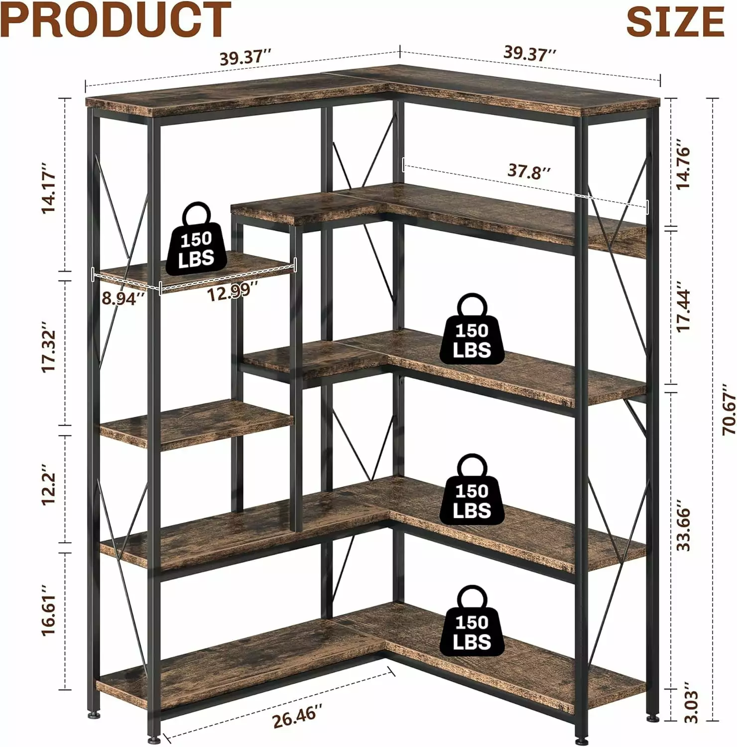 Product Description ZHIBING Modern Wooden Bookshelf for Home Office ZHIBING L Shaped Wide 5 Tier Bookshelves Our bookcase is crafted from a vintage particle board finish. its open design combines the charm of both minimalist and vintage furniture styles. You can put it in your study room. bedroom. and office. Choose ZHIBING Bookcase. and make your space neat. tidy. and also in great style. More Details for ZHIBING Bookshelf MDF Board and Iron Frame This bookcase is made of MDF board in a wood grain finish to deliver a rustic farmhouse feel. plus. it’s waterproof.scratch-resistant. easy to clean. Corner Bookshelf Its compact and sleek design fits seamlessly into corners. providing a unique and eye-catching storage solution for your treasures. Tipover Resistance Device The anti-tip accessory ensures that it won’t tip over and cause injury when pulled by external forces. thus keeping your family and pets safe. Adjustable Feet Adjustable feet for different height needs. protect the floor from scratches and ensure the bookcase keeps stable even on uneven floors. Brief content visible. double tap to read full content.Full content visible. double tap to read brief content.