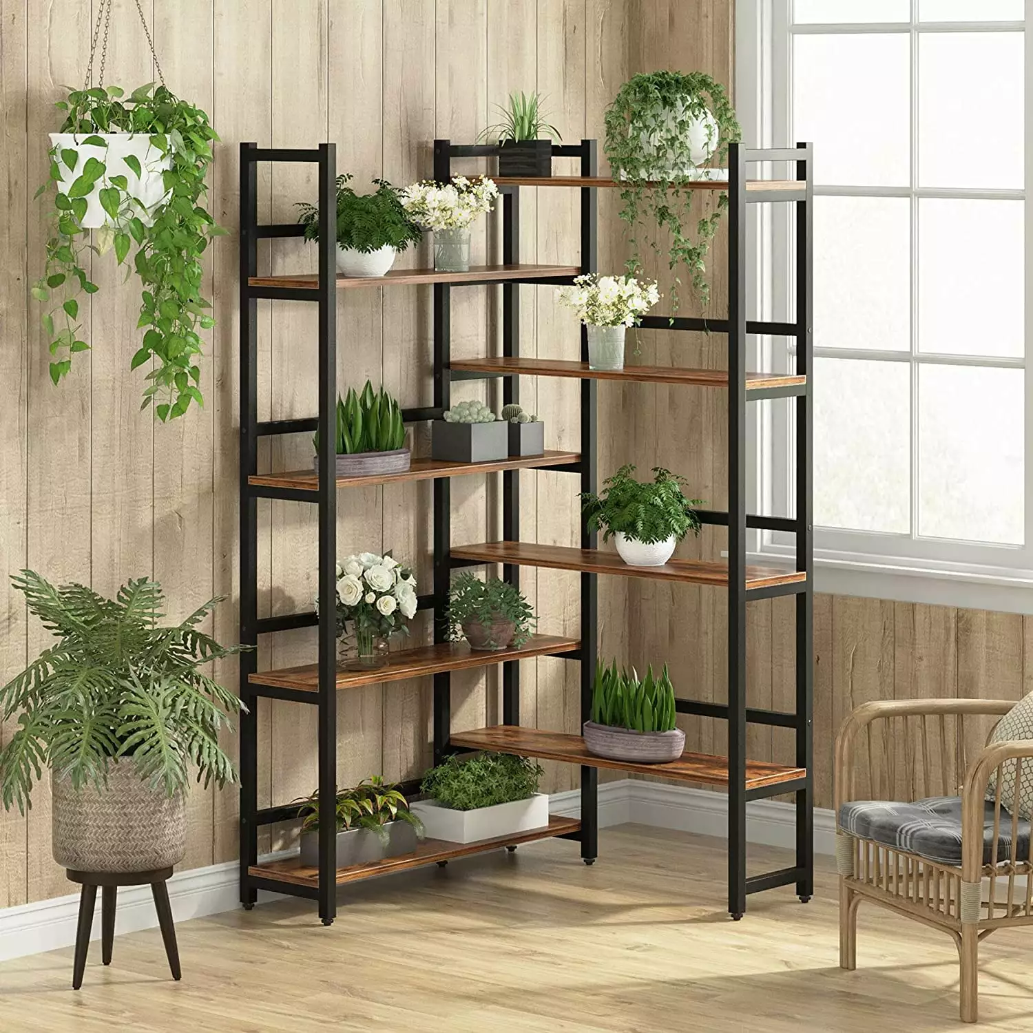 Product Description Product Specifications: Materials: Steel and MDFCount of Shelf: 8 shelvesDistance between shelves: 17.91"H eachShelves: "39.37W x 11.81"D eachOverall: 39.37"W x 39.37"D x 70.87"H. 72lbs.Assembly Require: Yes Package Contents: 1 x Bookcase 1 x Accessories Kit 1 x User Manual ZHIBING 8-tier Corner Bookcase The eye-catching shape makes it a stunning setting for your favorite books and collectibles. Combining the industrial look of steel with the warmth of wood. our shelving has a clean. contemporary design. Crafted of engineered wood and powder-coated steel. it features eight broad shelves for your large storage need. This multi-al shelving unit works anywhere from the living room to the office. Corner Design: Fits nicely against the wall and doesn’t occupy too much floor space. make full use of the limit corner space 8 Tier Large Storage Capacity: Provides plenty of storage space to keep all your books. models. crafts. and photos. etc. Industrial Style: This bookshelf’s industrial-chic looks match an array of modern furniture and you can mix and match to create your perfect room. Multal Storage Shelf: You can put it in any space of your home. such as living room. bedroom. corridor. kitchen. balcony. etc. Protective Rail The guardrail design not only strengthens the bookshelf. but also effectively prevents items from falling when it is not against the wall. Powerful Load Bearing We use solid engineered wood and premium iron frames to ensure the load-bearing capacity of each shelf. Retro Woodgrain Finish Made of laminated particle panels in woodgrain finish. with scratch-resistant. stains-resistant and waterproof design. this bookcase ensures a long lasting use. Adjustable Leg Pad With adjustable foot pads . the bookcase keeps stable even on uneven floor. No wobble any more! Brief content visible. double tap to read full content.Full content visible. double tap to read brief content.