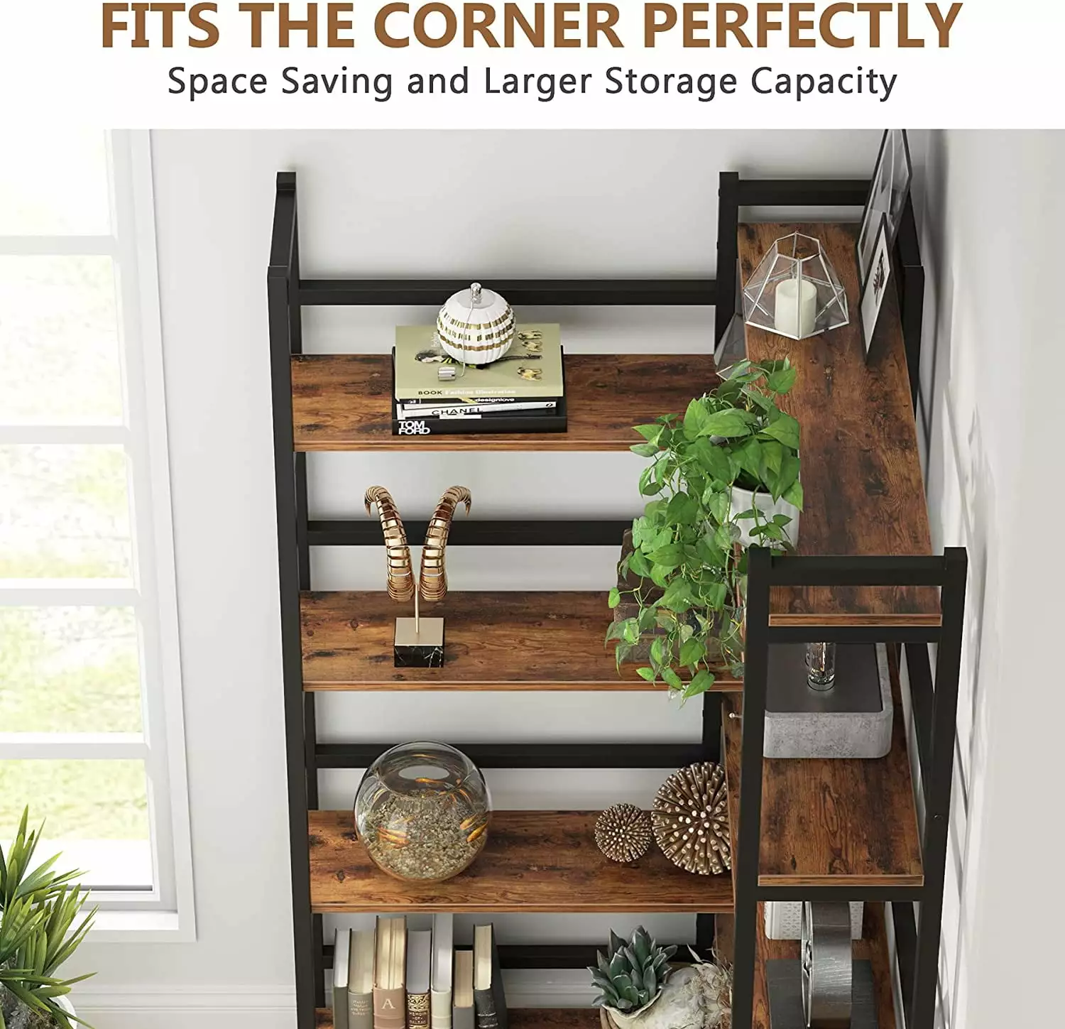 - Unique Corner Bookshelf: Combining the industrial look of steel with the warmth of wood. this shelving has a clean. contemporary design; Corner design greatly increases storage space. its multiple shelving giving versatile decorating options. This bookshelf’s industrial-chic looks match an array of modern furniture and you can mix and match to create your perfect room.